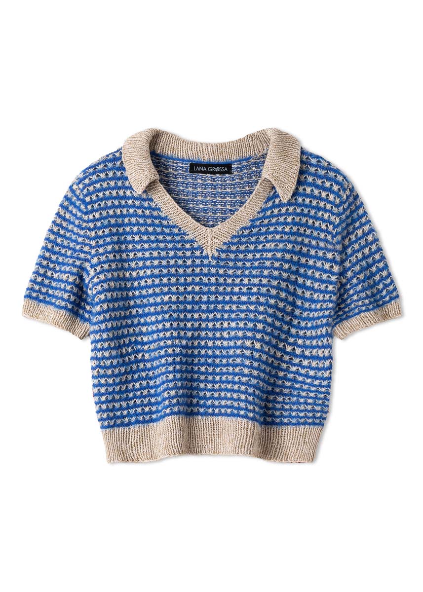 Lana Grossa „Diversa“ (74% bomull, 26% viskose, løpelengde 210 m/50 g), 150 (200 - 200) g i lin (farge 6) og Lana Grossa „Per Fortuna“ (74% bomull (bio), 26% polyamid, løpelengde 190 m/50 g), 100 (150 - 150) g i kongeblå (farge 51); pinner nr. 3,5 og nr. 4, 1 rundpinne nr. 3,5, 50 cm lang.