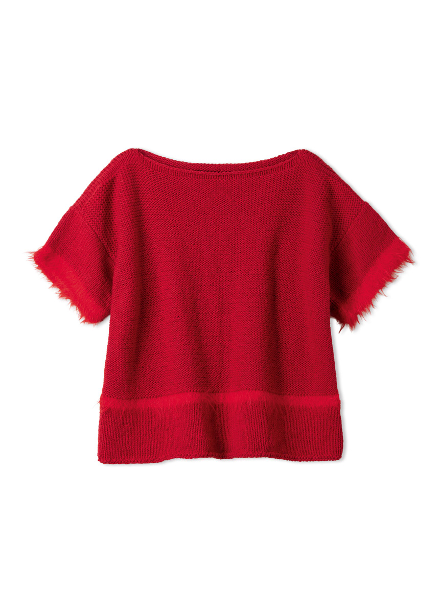 Lana Grossa-kvalitet „Ecopuno“ (72 % bomull, 17 % ren ny ull (merino), 11 % alpakka (Baby), løpelengde = ca 215 m/50 g): ca 400 (400 - 450 - 450) g rød (farge 6); Lana Grossa-kvalitet „Basta“ (50 % ren ny ull (merino), 50 % polyamid, løpelengde = ca 100 m/50 g): 50 (50 - 50 - 50) g refleksrød (farge 27); pinner nr. 6.