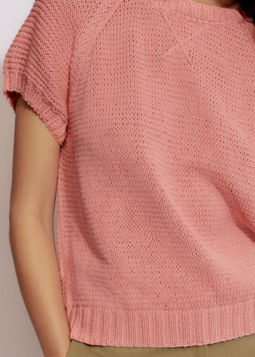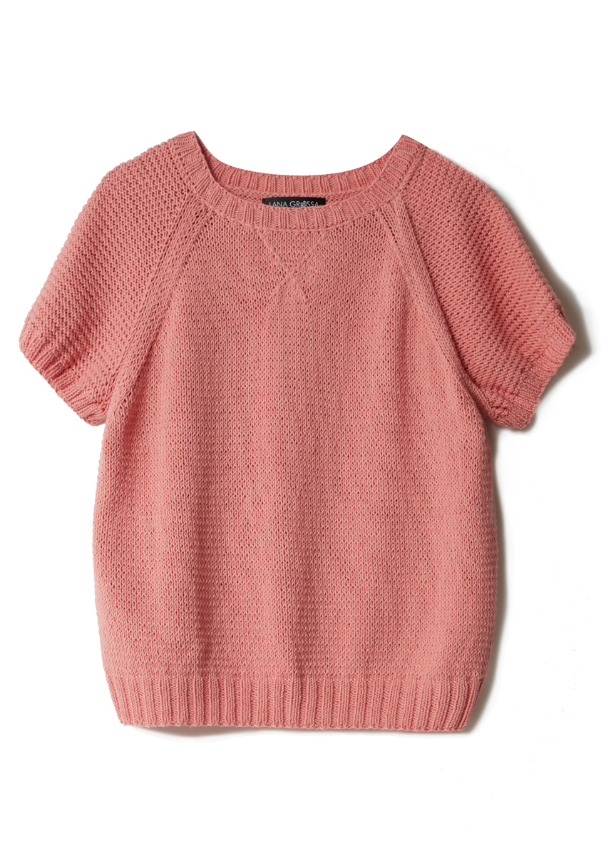 Lana Grossa Elastico (96% bomull, 4% polyester (Elité), löplängd 160 m/50 g), 250 (300 – 300) g lax (färg 132); stickor nr. 3,5, 4 och 5,5, 1 rundsticka nr. 3,5, 40 cm lång och 1 virknål nr. 3,5.