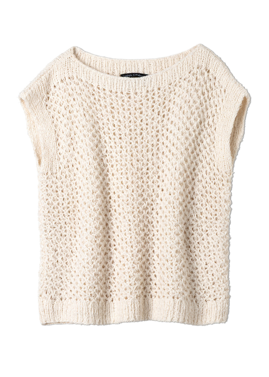 Lana Grossa Ella (100% bomull, løpelengde = ca 130 m/50 g), 250 (300 – 350) g i creme (farge 1). strikkepinner nr. 4,5 og nr. 5. 2 hjelpepinner til hvilende m.