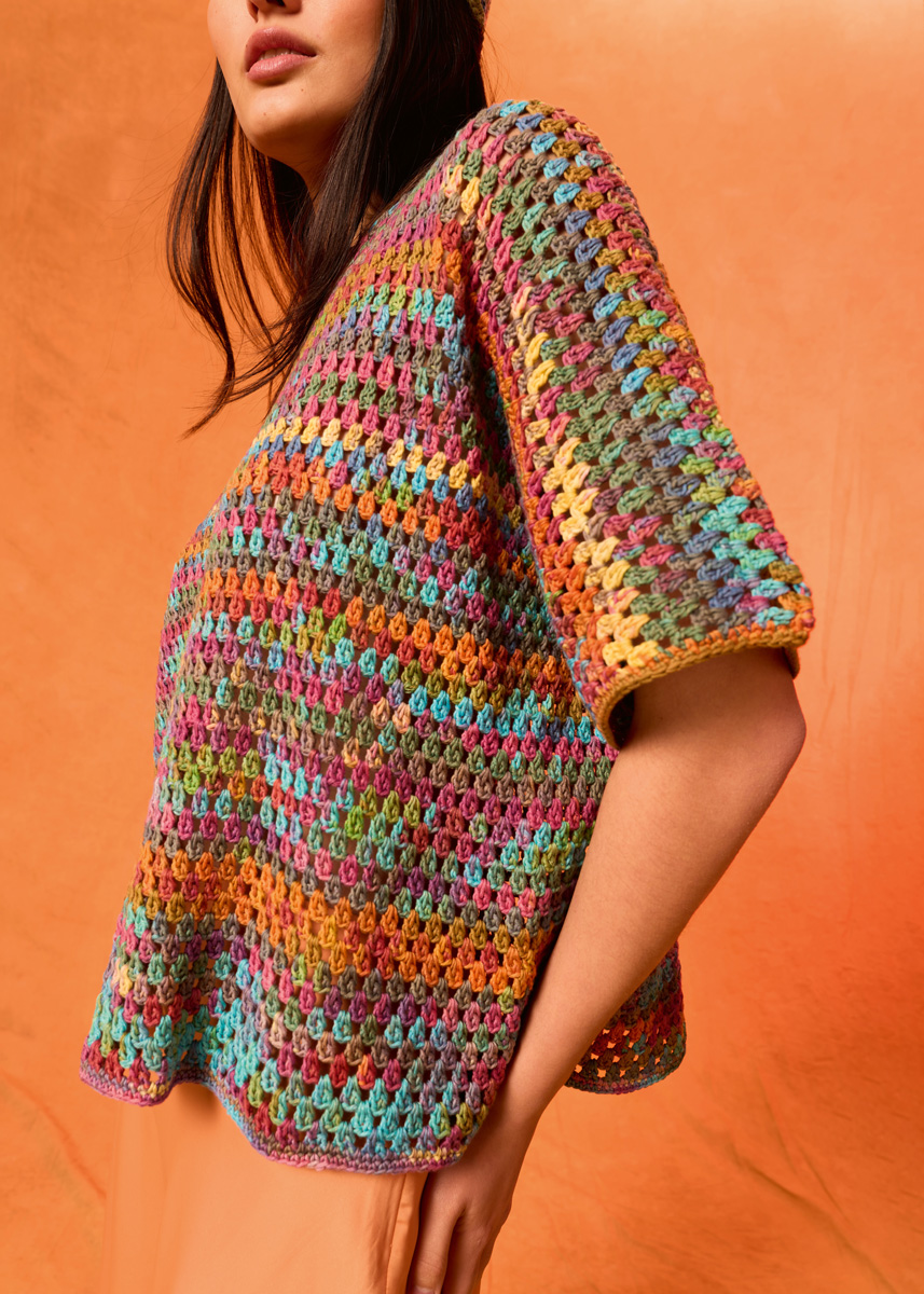 Lana Grossa-kvalitet „Gomitolo Alga“ (65 % bomull, 23 % viskose (bambus), 12 % seacell, løpelengde = ca 280 m/100 g): ca 4 (5 - 5 - 6) nøster = ca 400 (500 - 500 - 600) g grågrønn/tyrkis/fuchsia/gul/vårgrønn/oransje/olivenen/Himmelblå/blå/gammelrosa/hvit (farge 2027); heklenål nr. 3,5.