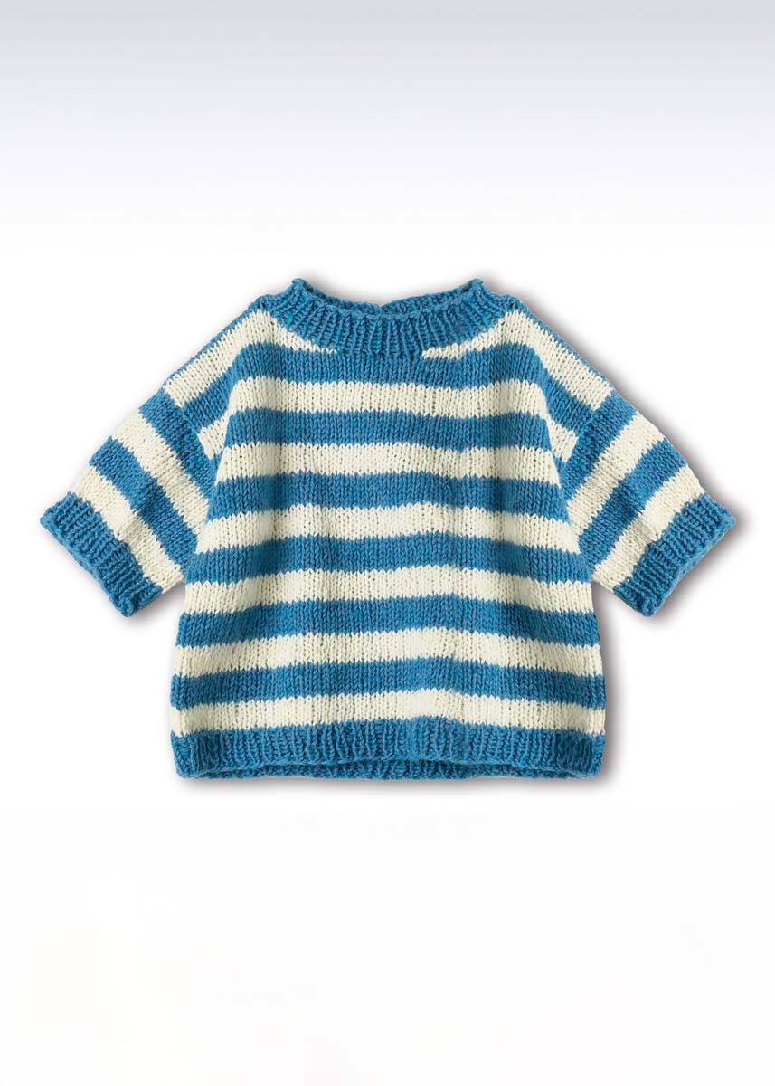 Lana Grossa Sottile (85 % bomuld, 15 % ren ny uld (merino), løbelængde = ca. 250 m / 50 gr.): 50 (50 – 50 – 100) gr himmelblå (fv 09) og Ecopuno (72 % bomuld, 17 % ren ny uld (merino), 11 % alpaka (baby), løbelængde = 215 m / 50 gr): 50 (50 – 50 – 100) gr ecru (fv 46), rundpind nr. 3, hæklenål nr. 3, 1 knap 11 mm Ø.