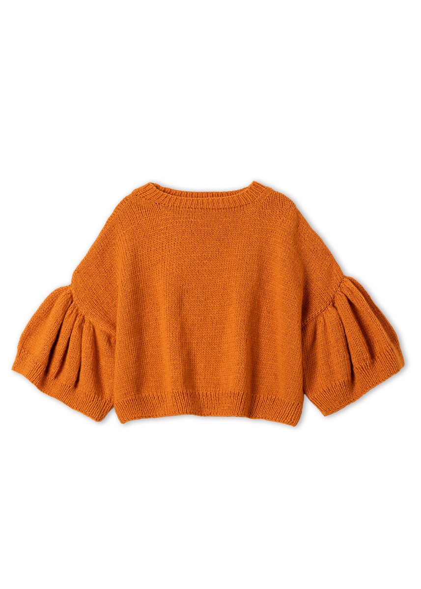 Lana Grossa-kvalitet „Summer Softness“ (80 % bomull (bio), 20 % ren ny ull (merino superfine), løpelengde = ca 130 m/50 g): ca 400 (400 - 450 - 450) g brunoransje (farge 22); strikkepinner nr. 4 og nr. 5,5. 1 kort rundpinne nr. 4.