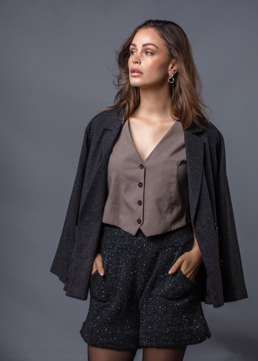 Shortsen stickas uppifrån och ned, först runt till bålen, därefter fram och tillbaka. Fickorna stickas separat och sys på efteråt. Modellen har en benlängd av 12 cm, midjemåttet mäter 62 (70 - 78 - 86 - 98 - 110) cm, dubbel-måttet runt låren mäter 52 (60 - 65 - 72 - 79 - 85) cm och höftomkretsen mäter 86 (94 - 102 - 110 - 122 - 134) cm.