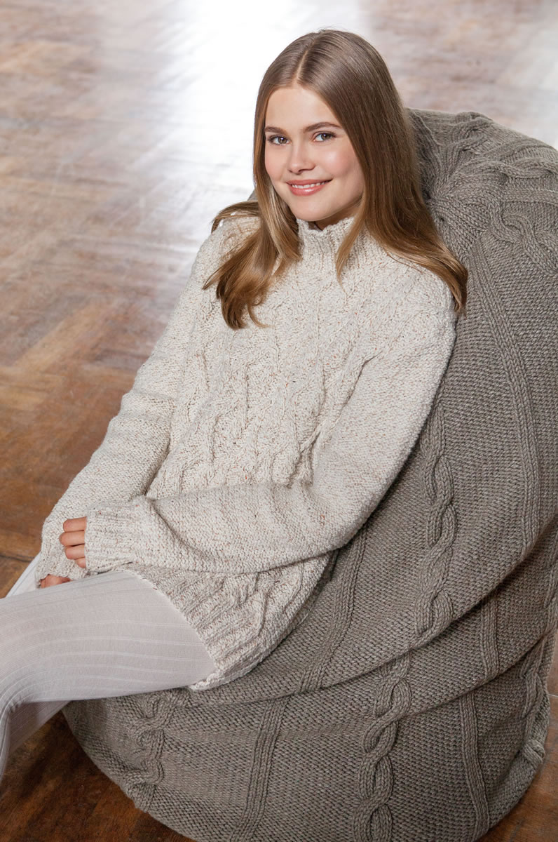 Lana Grossa-Qualität „Mille II” (50 % Schurwolle (Merino extrafine), 50 % Polyacryl, waschmaschinenfest, LL = ca. 55 m/50 g): ca. 1800 g Taupe (Fb. 52); Spielstricknadeln Nr. 6, je 1 Rundstricknadel Nr. 6, 60, 80, 100 und 120 cm lang, 2 Zopfnadeln von Lana Grossa; über www.kissenwelt.de 1 Innenfutter für einen Sitzsack, 130 x 170 cm, als Füllung Styroporkügelchen Comfort, ca. 100 l (Kosten für Innenfutter und Füllung ca. 50 Euro).