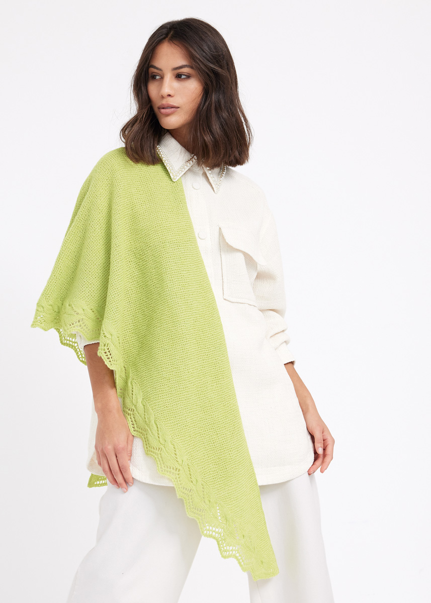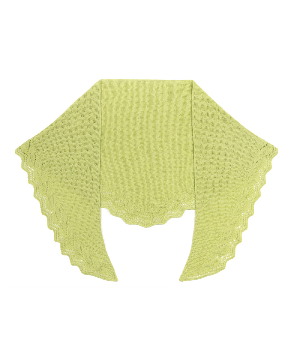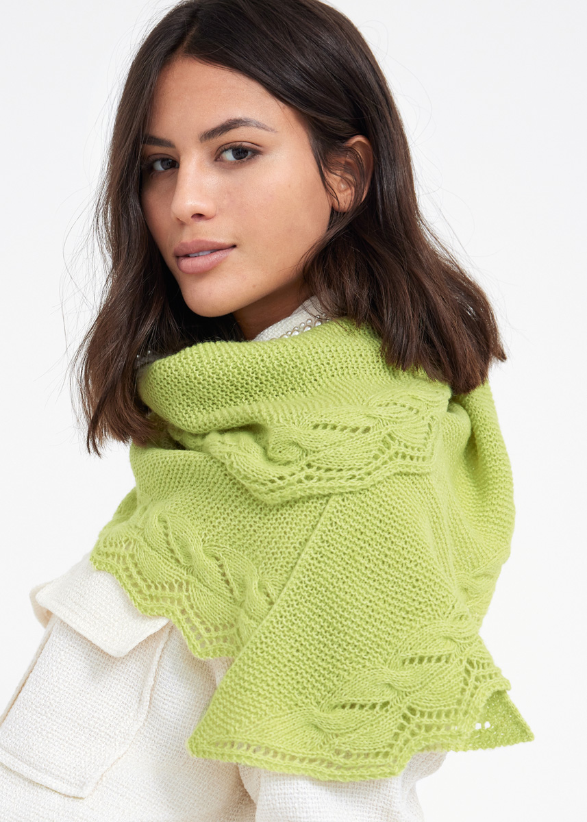 Lana Grossa Allora (76% bomull, 14% ren ny ull (superfin merino), 10% (baby) alpacka, löplängd 300 m/50 g), 150 (200) g gulgrön (färg 2); 1 rundsticka nr. 3,5, 80 cm lång, 1 virknål nr. 3, 1 flätsticka/hjälpsticka och 1 maskmarkör.