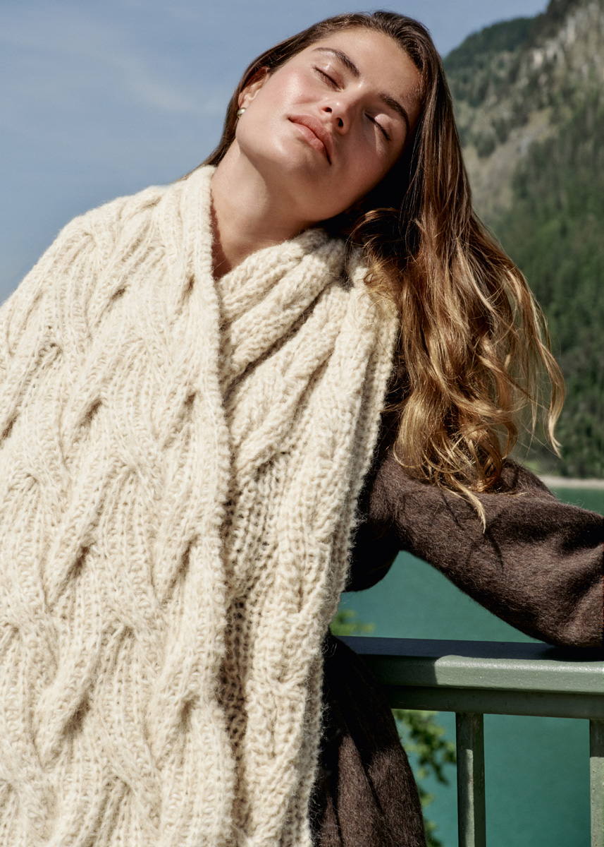 Lana Grossa „Alpaca Air“ (62% (baby) alpacka, 27% polyamid, 11% ren ny ull (merino fine), löplängd = 140 m/50 g): 300 g in beige (färg 2); stickor nr. 5, 1 hjälp- eller flätsticka.
