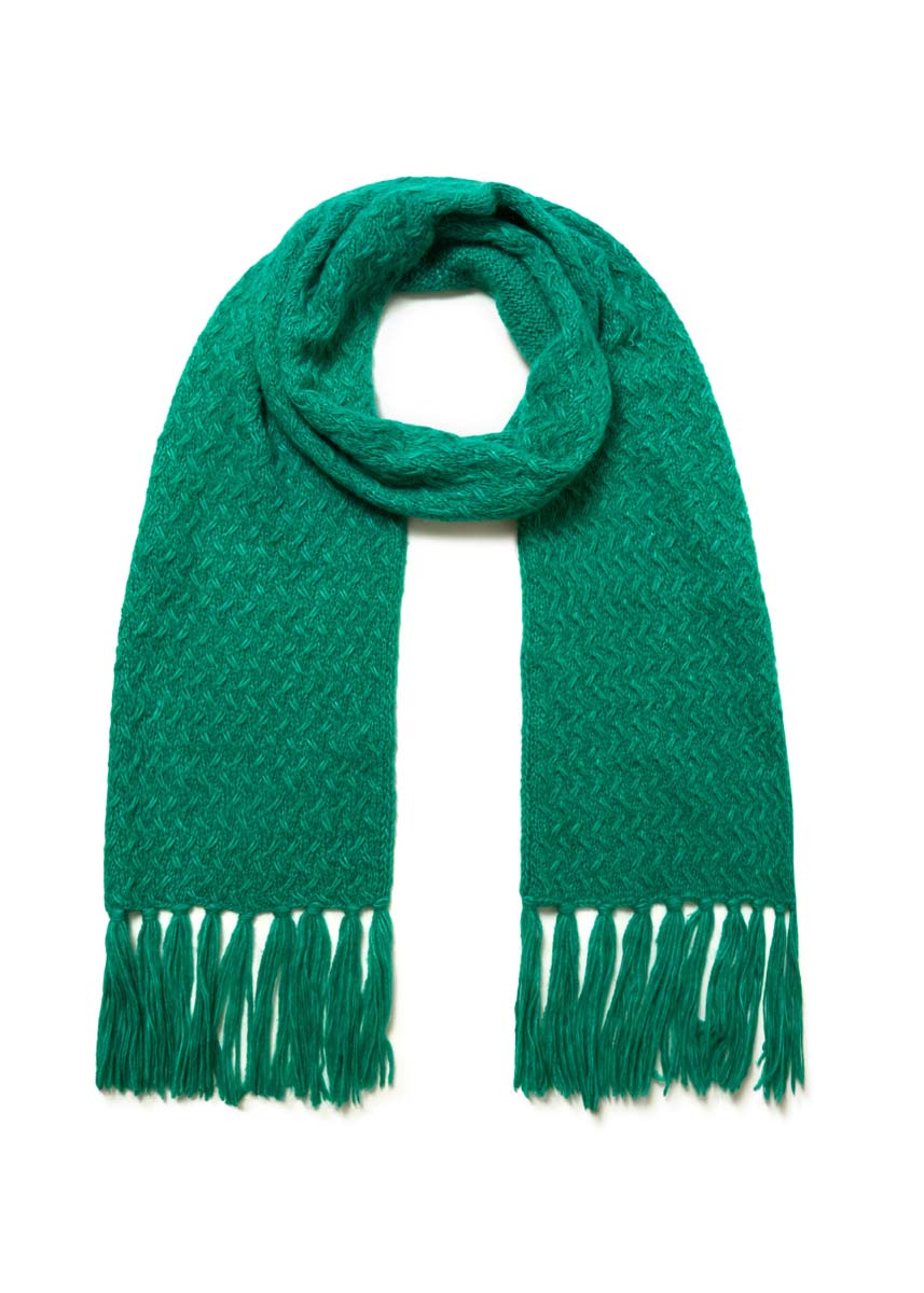 Lana Grossa-kvalitet „Alpaca Air” (62 % (baby) alpacka, 27 % polyamid, 11 % ren ny ull (Merino Fine), löplängd = ca. 140 m/50 g): ca. 350 g jadegrün (färg 24); stickor nr. 7, 1 virknål nr. 8 till fransarna.