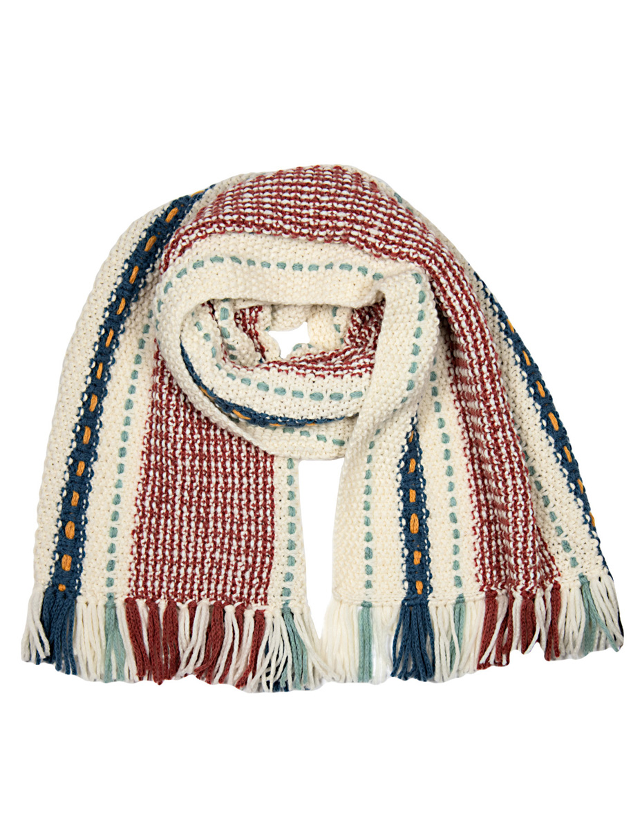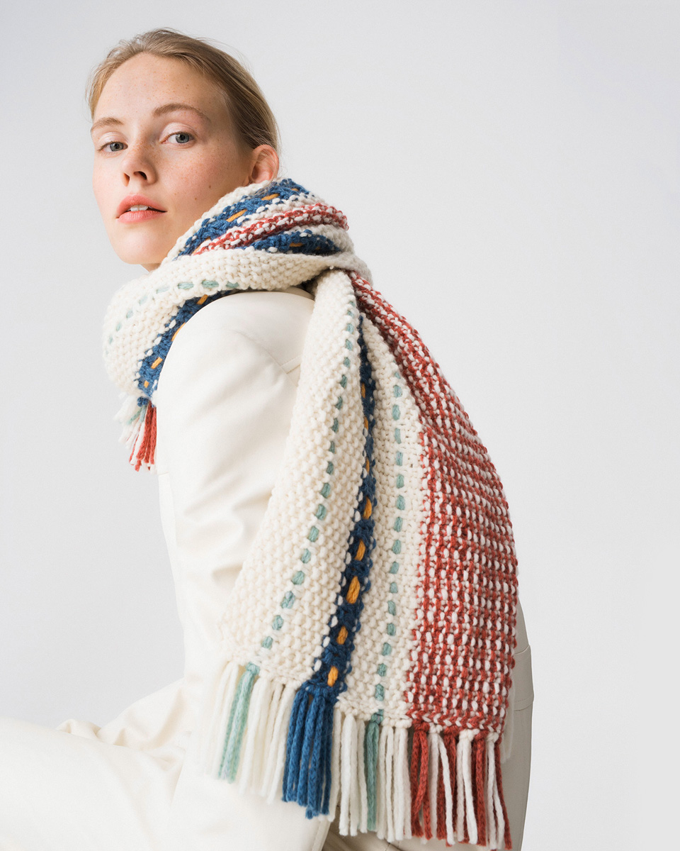 Lana Grossa Alta Moda Cashmere 16 (78 % virgin ull, 12 % kashmir, 10 % polyamid, löplängd 110 m / 50 g) 300 g råvit (färg 16), 100 g lerröd (färg 30), 50 g duvblå (färg 33), 50 g kvitten (färg 28) och 50 g mintturkos (färg 34); rundsticka nr. 7 (120 cm lång), virknål nr. 6.