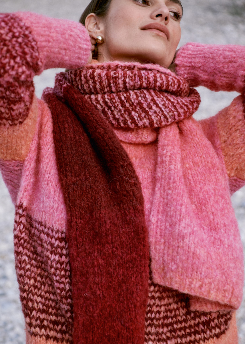Lana Grossa „Avio“ (63% alpacka (Fine), 37% polyamid, löplängd = 150 m/50 g): je 100 g i orientröd/mörk röd (färg 14) och i hallon/aprikos (färg 12); 1 rundsticka nr. 7.