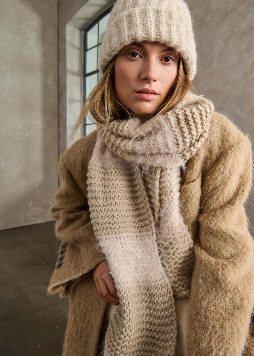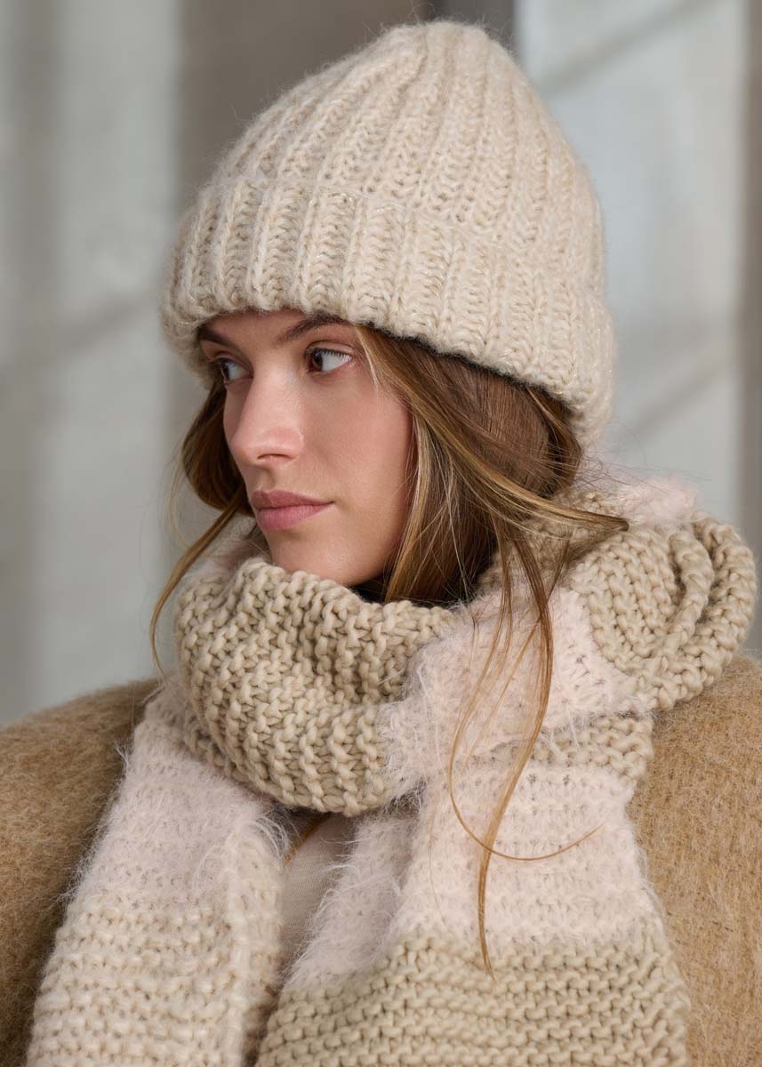 Lana Grossa „Per Lei“ (100% ren ny ull (merino), löplängd= ca. 60 m/50 g): ca. 150 g beige (färg 19) „Basta“ (50% ren ny ull (merino), 50% polyamid, löplängd= ca. 100 m/50 g): ca. 100 g beige (färg 3) „Alpaca Air“ (62% alpacka (baby), 27% polyamid, 11% ren ny ull (fin merino), löplängd= ca. 140 Meter/50 g): ca. 100 g beige (färg 2), stickor nr. 10
