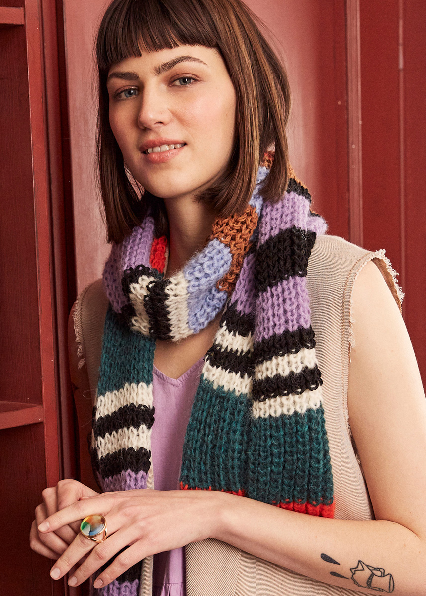 Restgarn från Pullover med randiga ärmar, Modell 11. Stickor 8 (löst stickat) eller 9 (hårt stickat) – viktigt att stickfastheten stämmer.
