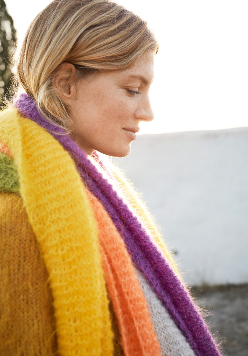 Lana Grossa-kvalitet ”Brigitte No. 3” (40 % mohair, 37 % ren ny uld, 23 % polyamid, løbelængde = ca. 100 m / 25 gr.): Til hvert tørklæde skal valgfrit bruges: ca. 100 gr gul (fv 1), orange (fv 2), violet (fv 5), oliven (fv 14) eller beige (fv 18). Strikkepinde nr. 5