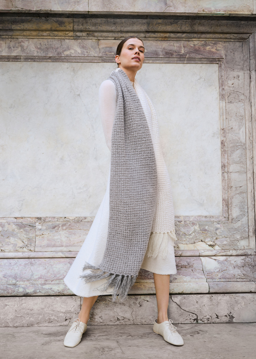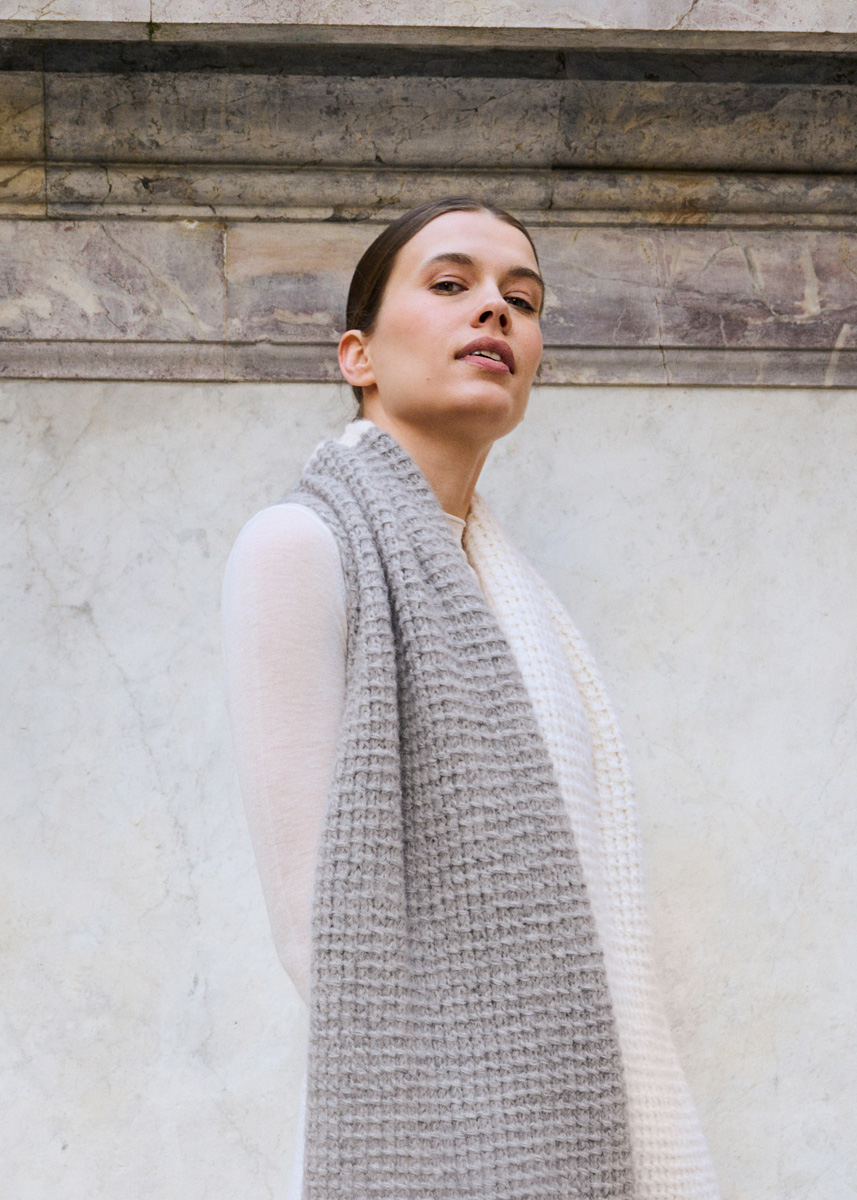 Skjerfet blir strikket med tre tråder – to tråder Setasuri og en tråd Cashmere 16 Fine ton i ton.