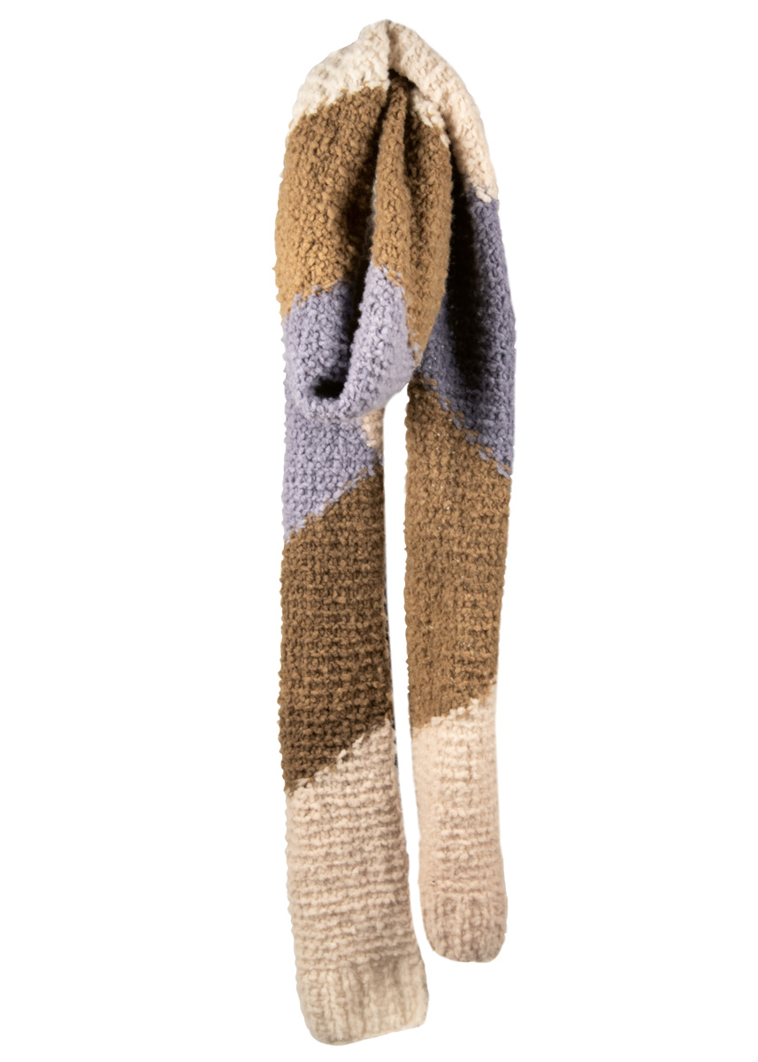 Lana Grossa Lala Berlin Cloudy (93% ren ny ull (merino extrafine), 7% nylon, löplängd 100 m/50 g), 100 g beige (färg 1), 100 g nougat (färg 2) och 100 g grålila (färg 5); stickor nr. 8.