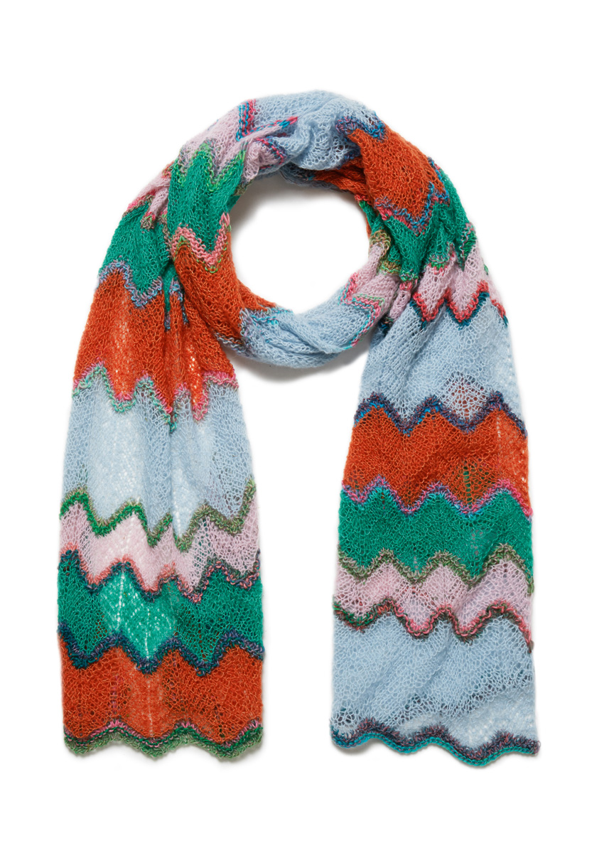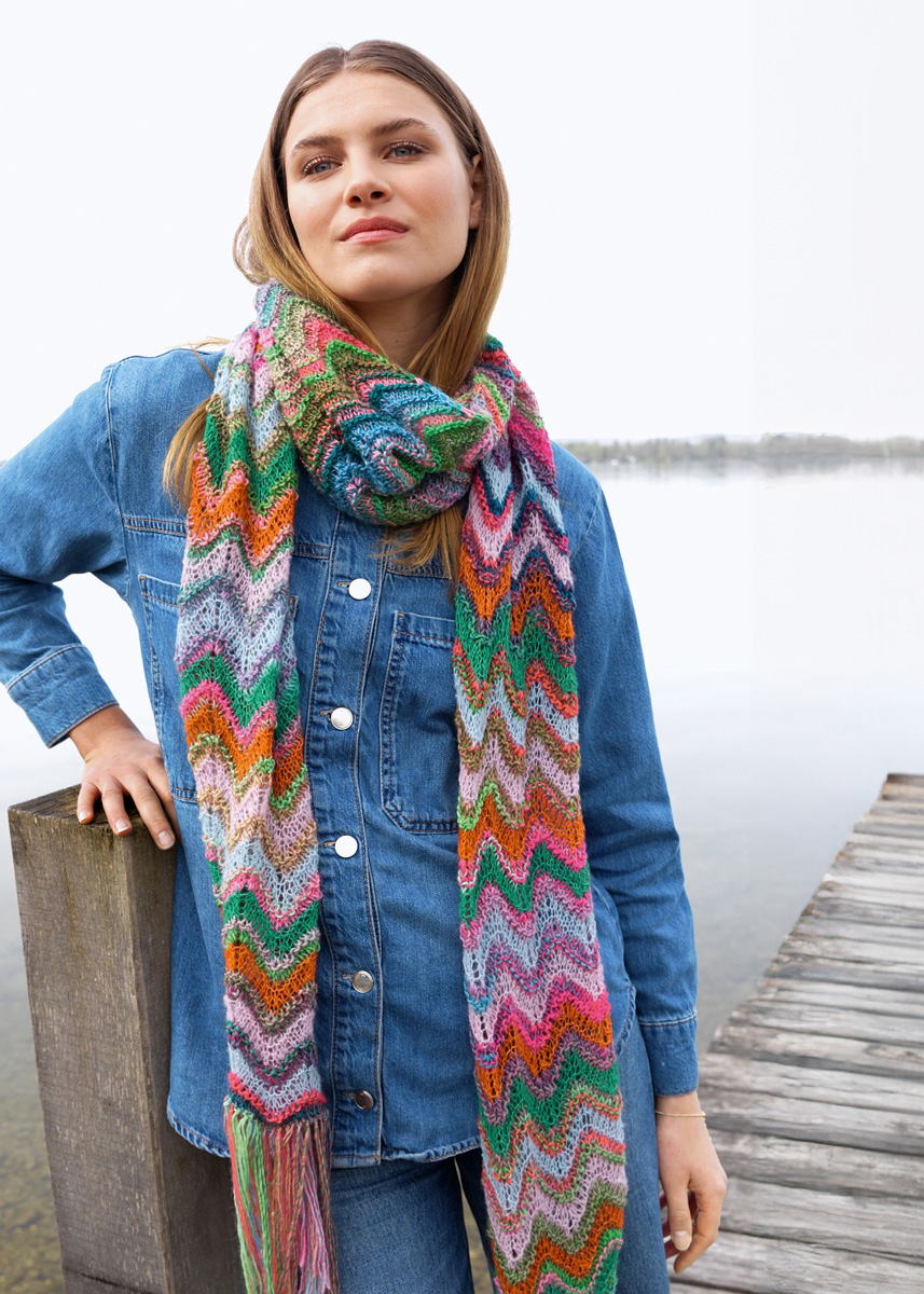 Sjal 13a/b: Lana Grossa Colorissimo (100% ren ny ull (merino extrafin), löplängd 300 m/100 g), 100 g petrolblå/pink/äppelgrön/ljusgrön/röd/jade/svartblå (färg 203) och Lana Grossa Soffio (60% ren ny ull (merino superfin), 30% (bio) bomull, 10% kashmir, löplängd 212 m/25 g), 50 g grön (färg 9), 50 g rostorange (färg 5), 50 g Rosa (färg 1) och 50 g ljusblå (färg 13); stickor nr. 5,5, Sjal 13a: 1 virknål nr. 4,5 till fransarna.