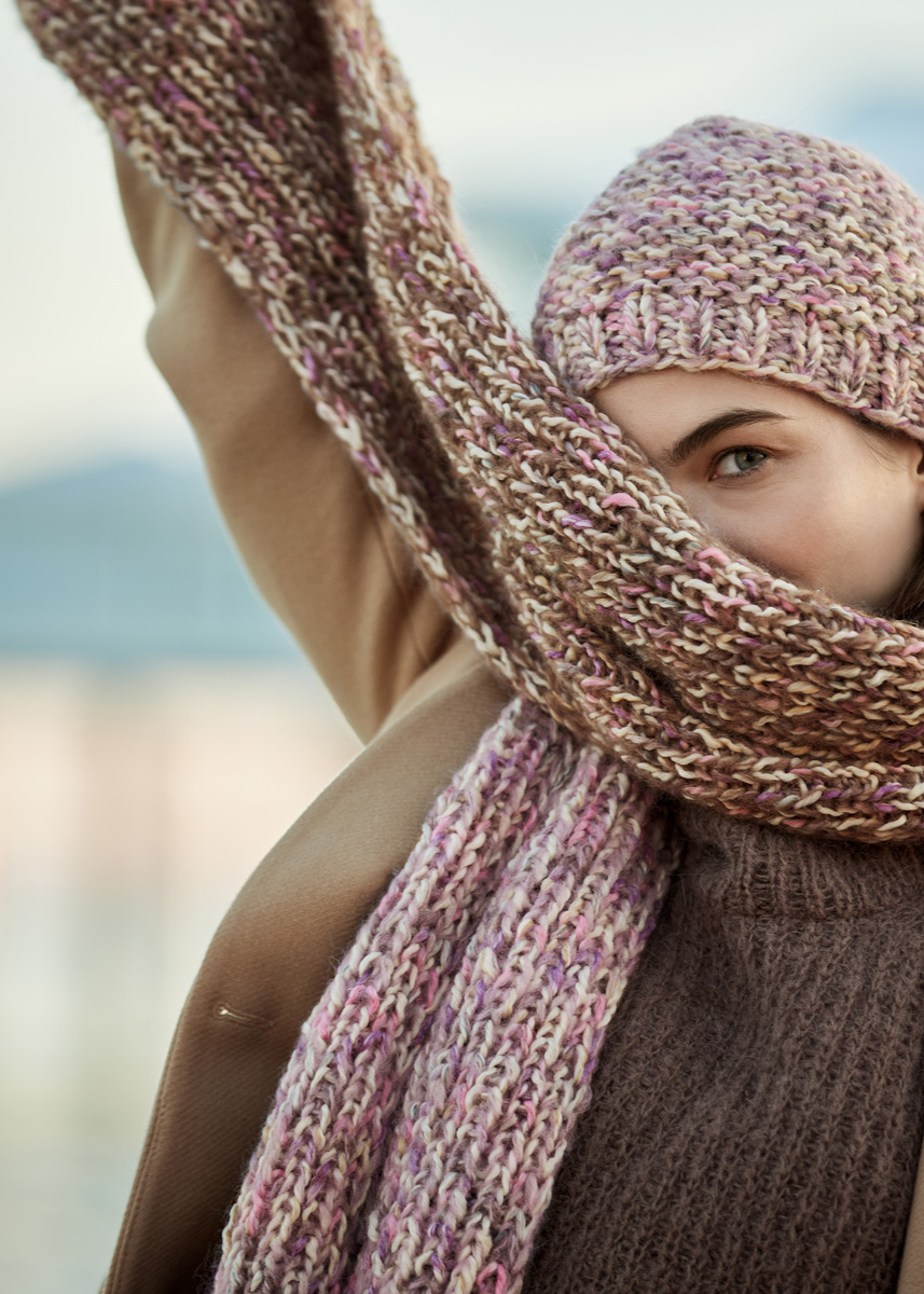 Lana Grossa-kvalitet „Colortwist“ (74 % ren ny ull (merino), 20 % bomull, 6 % polyamid, löplängd = ca 90 m/50 g): ca 200 g vit/rosa/grå/mauve (färg 1) och „Setasuri Big“ (70 % alpacka (Suri), 20 % silke, 10 % ren ny ull (merino), löplängd = ca 100 m/25 g): ca 50 g var i syren (färg 503) och nougat (färg 518); stickor nr. 7. Obs: St sjalen med dubbla trådar: 1 tråd i Colortwist och 1 tråd i Setasuri Big.