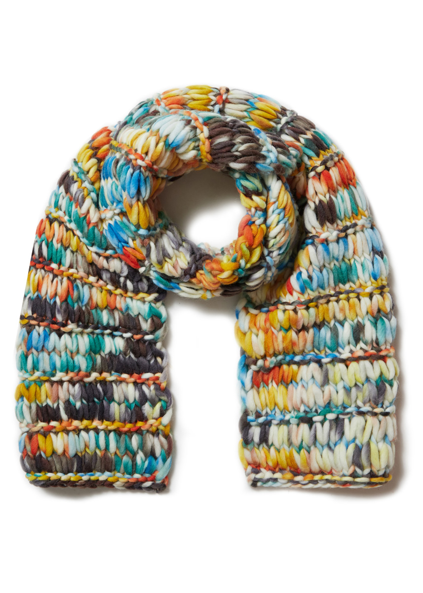 Lana Grossa „Confetti“ (100% ren ny ull (merino), löplängd 50 m/100 g), 400 g råvit/rost/petrol/anthracit/orange (färg 7); stickor nr. 12.