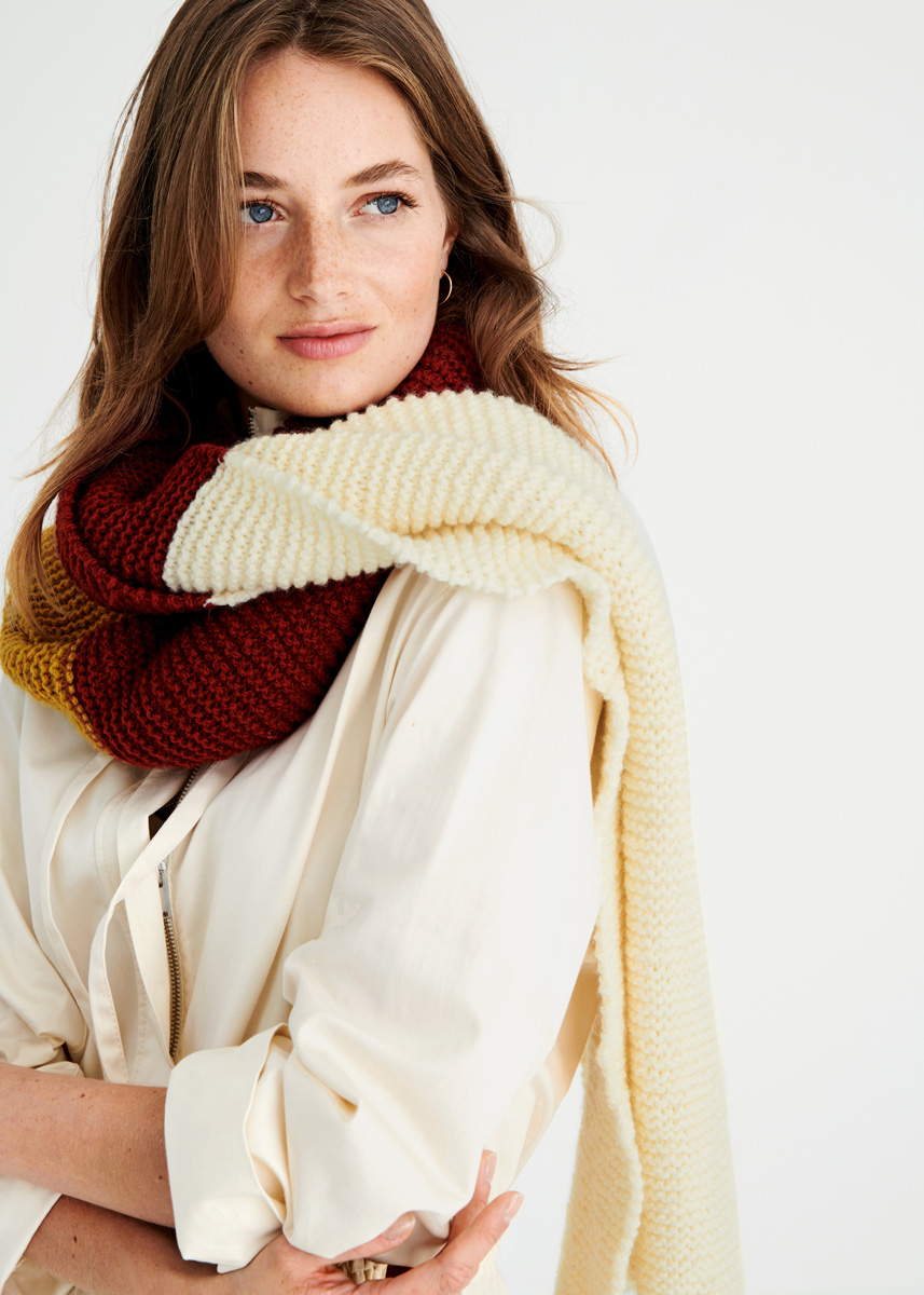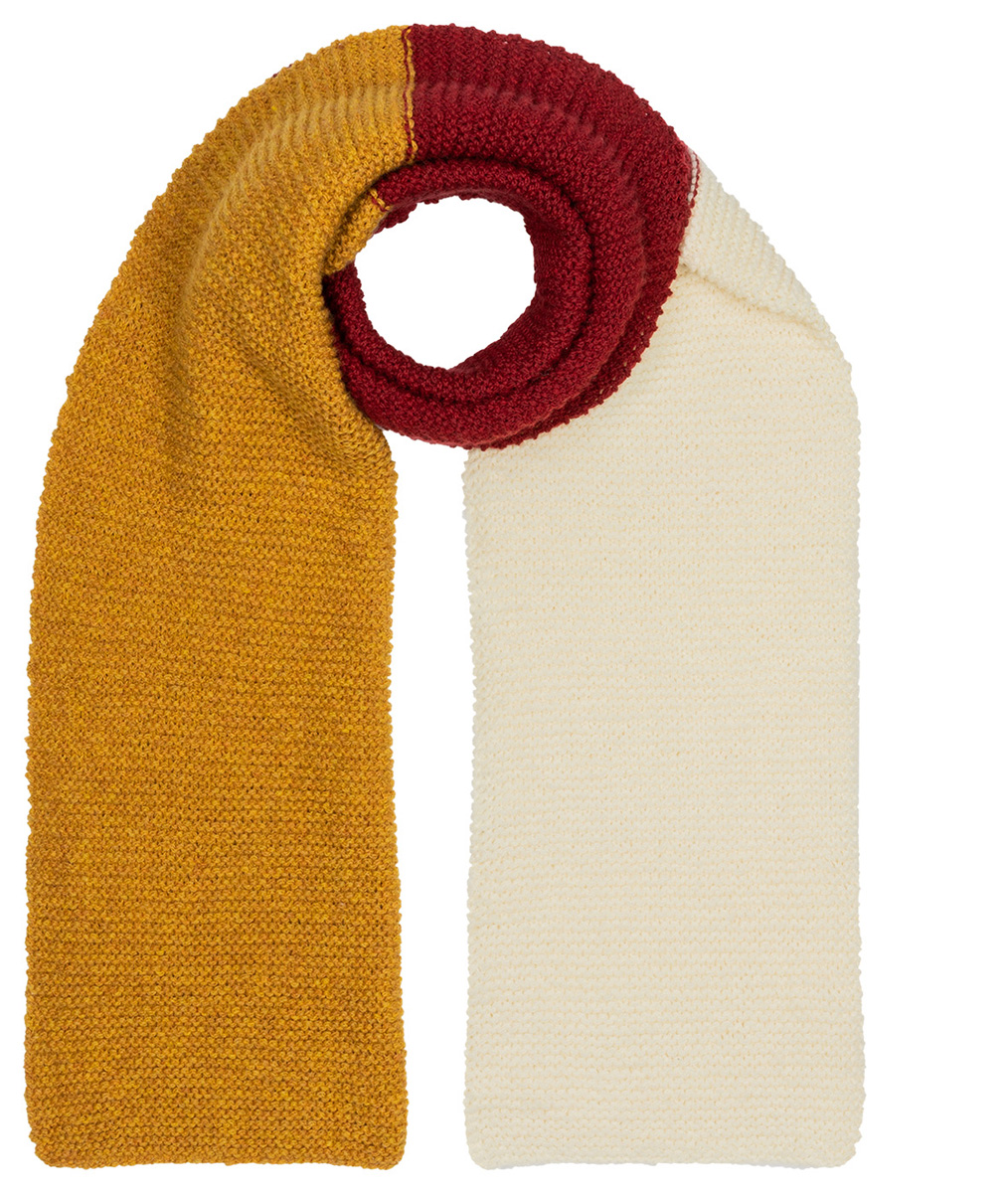 Lana Grossa-kvalitet „Cool Merino” (90 % ren ny ull (merino), 10 % polyamid, löplängd = ca. 150 m/50 g): ca. 150 g var i mörk röd (färg 1), guldgul (färg 8) och vit (färg 15); 1 rundsticka nr. 6, 60 cm lång