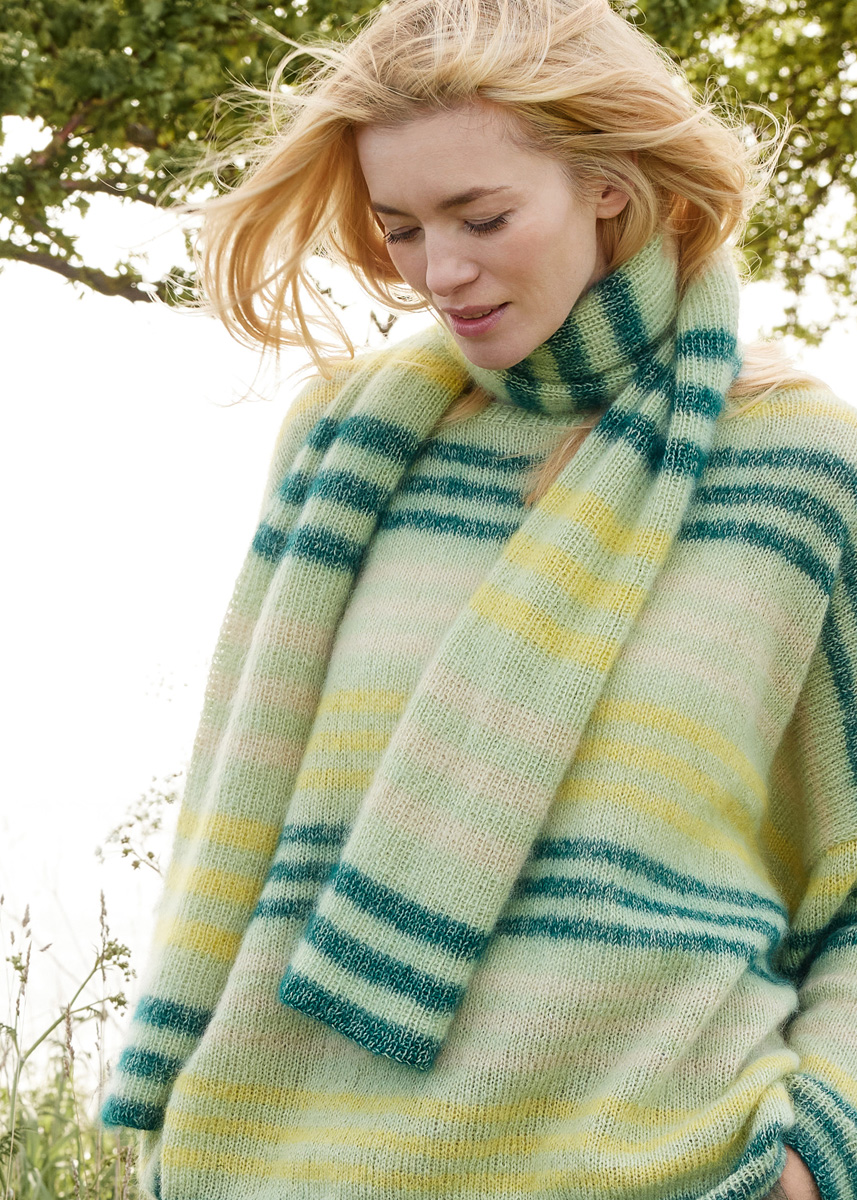 Lana Grossa Cool Wool Lace (100% ren ny ull (merino), LL = ca 400 m/50 g), 100 g pastellgrønn (frg 65). Lana Grossa Silkhair (70% mohair (superkid), 30% silke, LL = ca 210 m/25 g), 50 g blek grønn (frg 211), 25 g påskelilje (frg 217), grangrønn (frg 219) og pudderbeige (frg 213) Pinner: Nr. 4