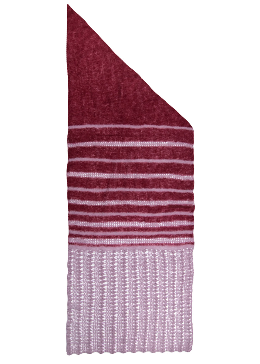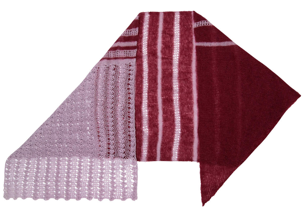 Lana Grossa Cool Wool Lace (100% ren ny ull merino ekstrafin, løpelengde 400 m/50 g), 100 g syrin (farge 15) og Silkhair (70% mohair, 30% silke, løpelengde 210 m/25 g), 50 g bordeaux (farge 113); strikkepinner nr. 5 og 1 heklenål nr. 3,5.