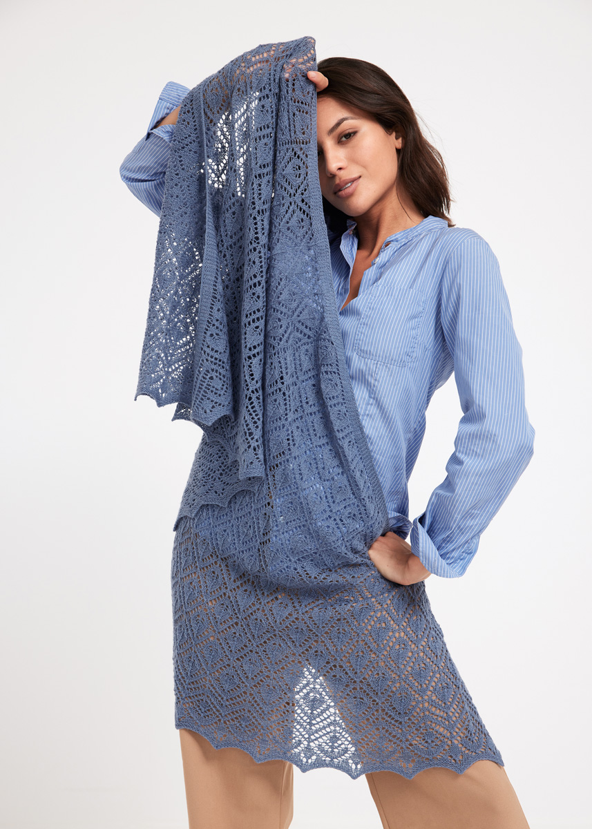 Lana Grossa Cool Wool Lace (100 % ren ny uld, løbelængde = ca. 400 m / 50 gr.), 200 g dueblå (fv 2); rundpind nr. 3,5, 100 cm, hæklenål nr. 3.