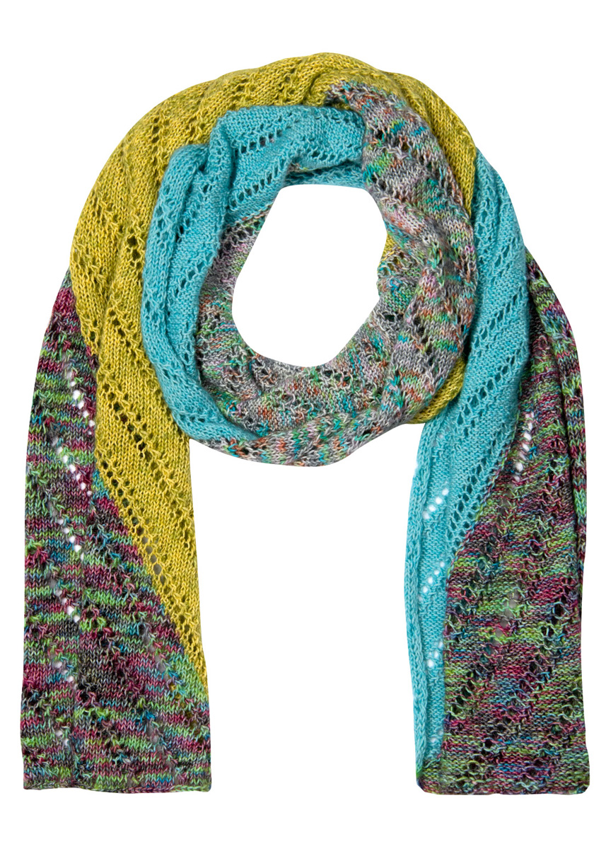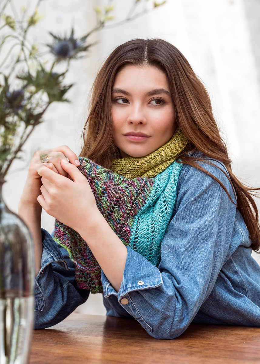 Lana Grossa Ecopuno hand-dyed (72% bomull, 17% ren ny ull merino, 11% baby alpacka, löplängd 215 m/50 g), 50 g ljus grön/björnbär/petrol/grålila/bordeaux (färg 502) och 50 g turkos/orange/violett/björnbär/gul/petrol/grå/anthracit (färg 503) och Lana Grossa Ecopuno (72% bomull, 17% ren ny ull merino, 11% baby alpacka, löplängd 215 m/50 g), 50 g gulgrön (färg 3) och 50 g turkos (färg 28); stickor nr. 4,5.