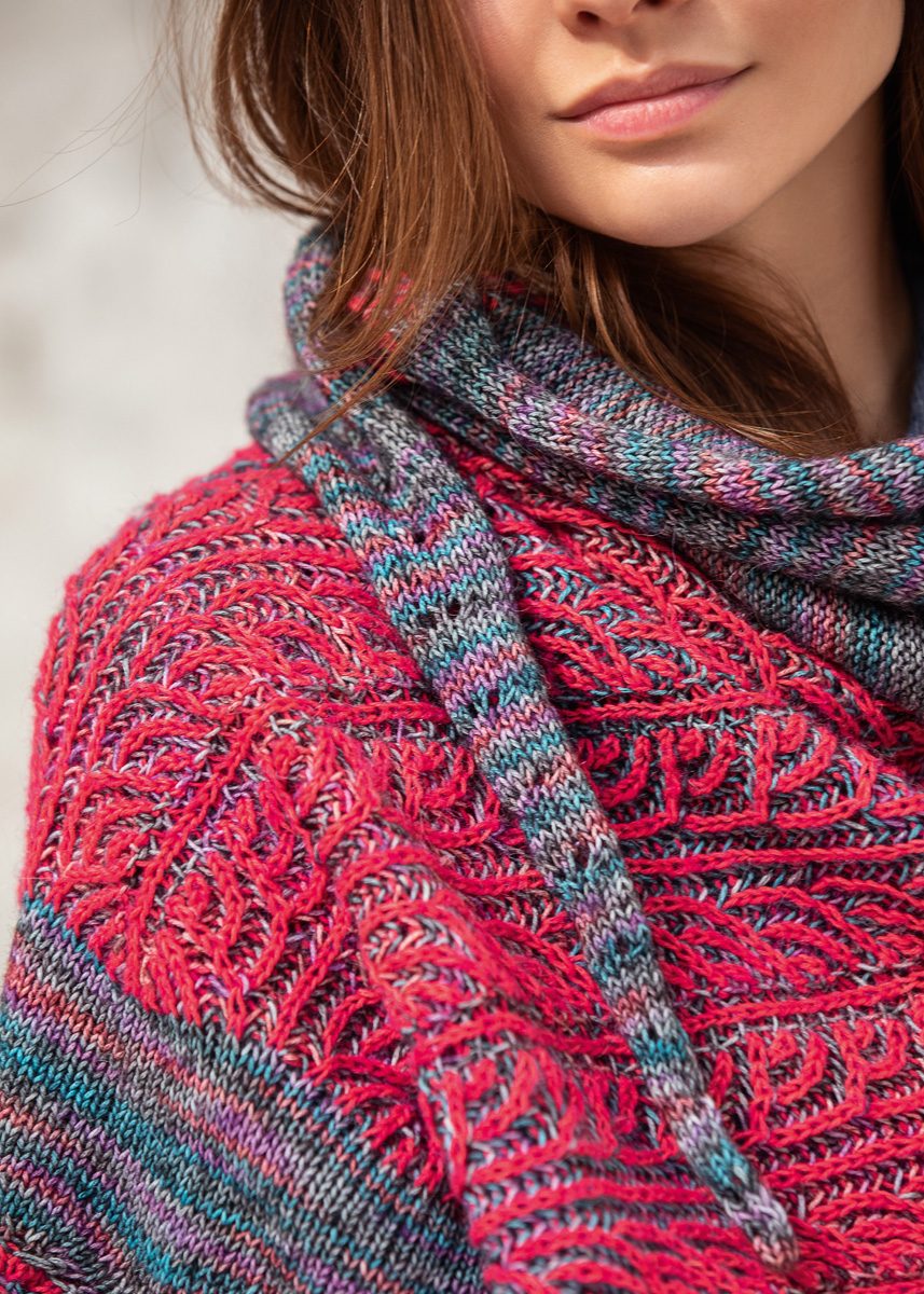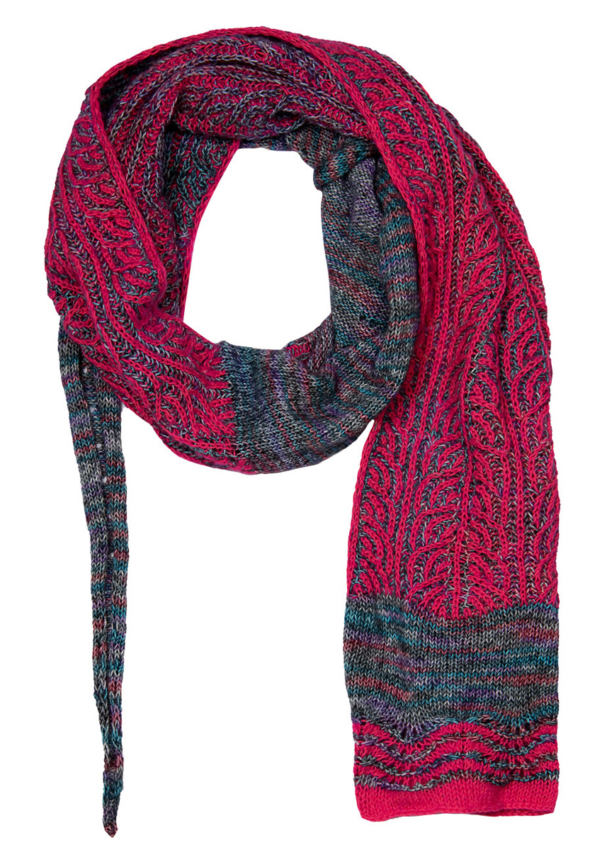 Lana Grossa Ecopuno hand-dyed (72% bomull, 17% ren ny ull merino, 11% baby alpacka, löplängd 215 m/50 g), 150 g mörk grå/anthracit/violett/terrakotta/petrol (färg 501) och Ecopuno (72% bomull, 17% ren ny ull merino, 11% baby alpacka, löplängd 215 m/50 g), 150 g hallon (färg 36); 1 rundsticka nr. 4, 60 cm lång, 1 hjälpsticka.