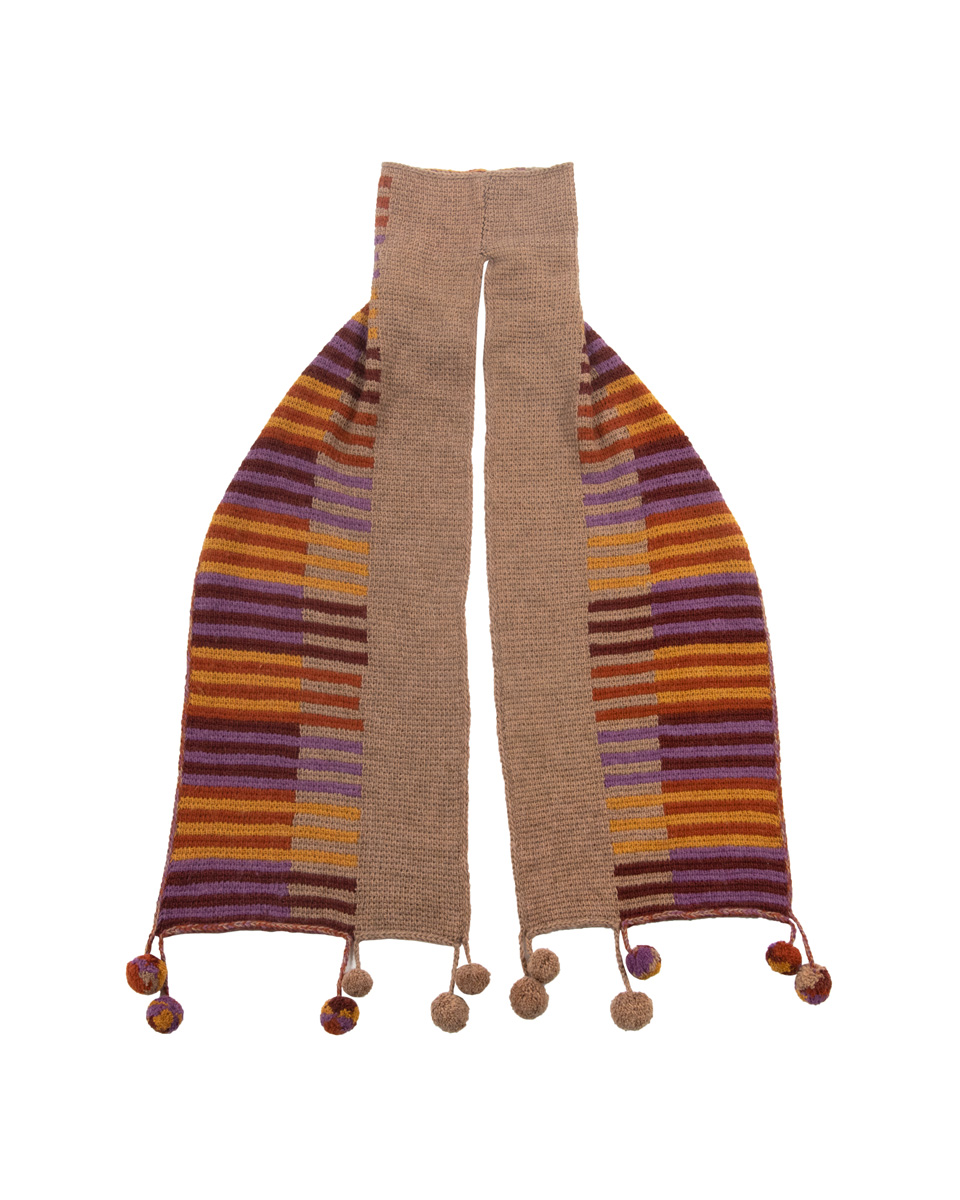 Lana Grossa Ecopuno (72 % bomuld, 17 % ren ny merino, 11 % (baby) alpaka, løbelængde = ca. 215 m / 50 gr.), 250 g camel (fv 32), 50 g brunrød (fv 31), 50 g gulorange (fv 33), 50 g kanelbrun (fv 49) og 50 g bær (fv 40); tunesisk hæklenål nr. 6 med forlængelse fra Knit Pro, pompon-sæt fra Lana Grossa Ø 3,5 – 4,5 cm.