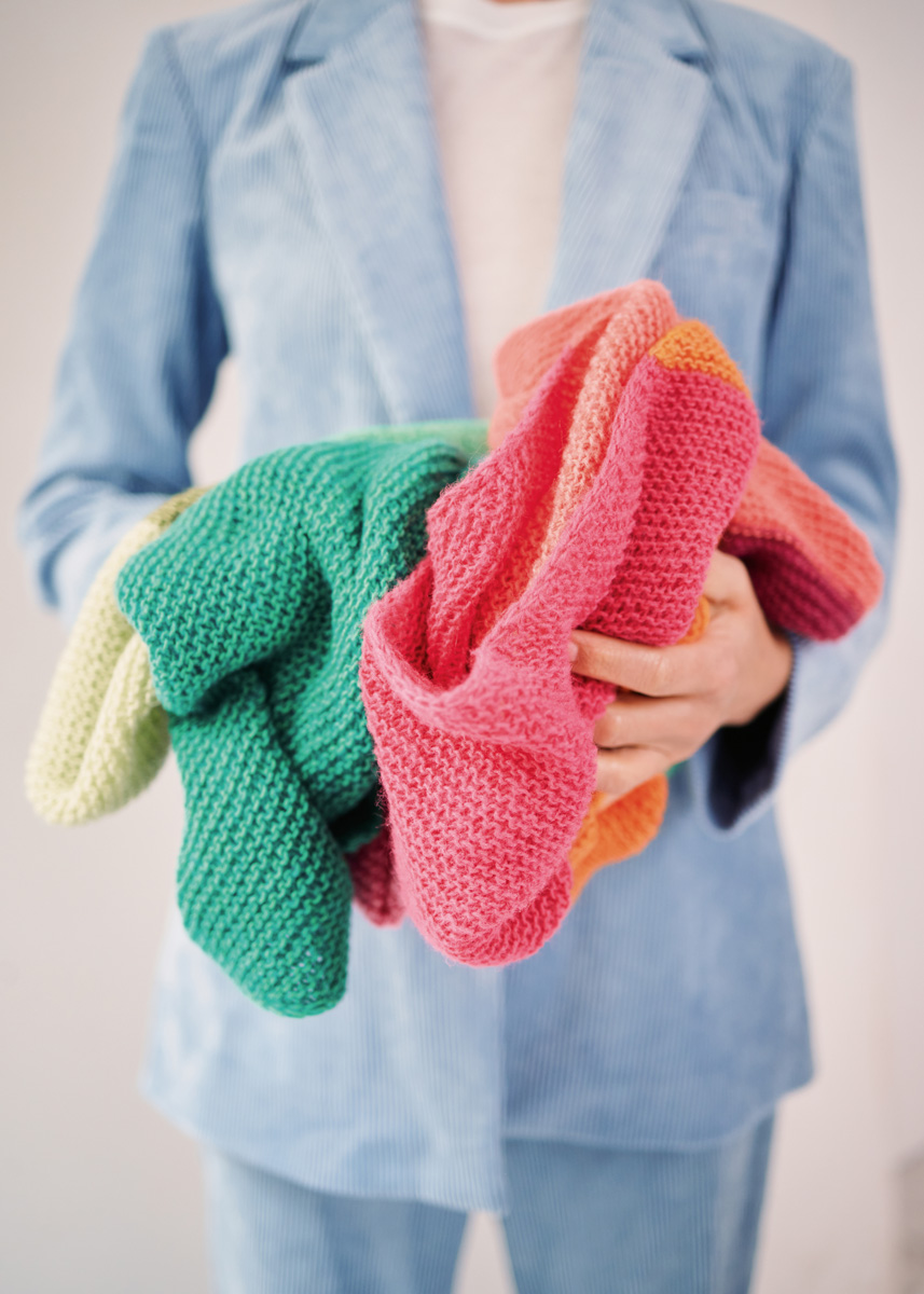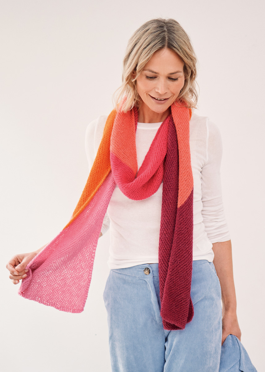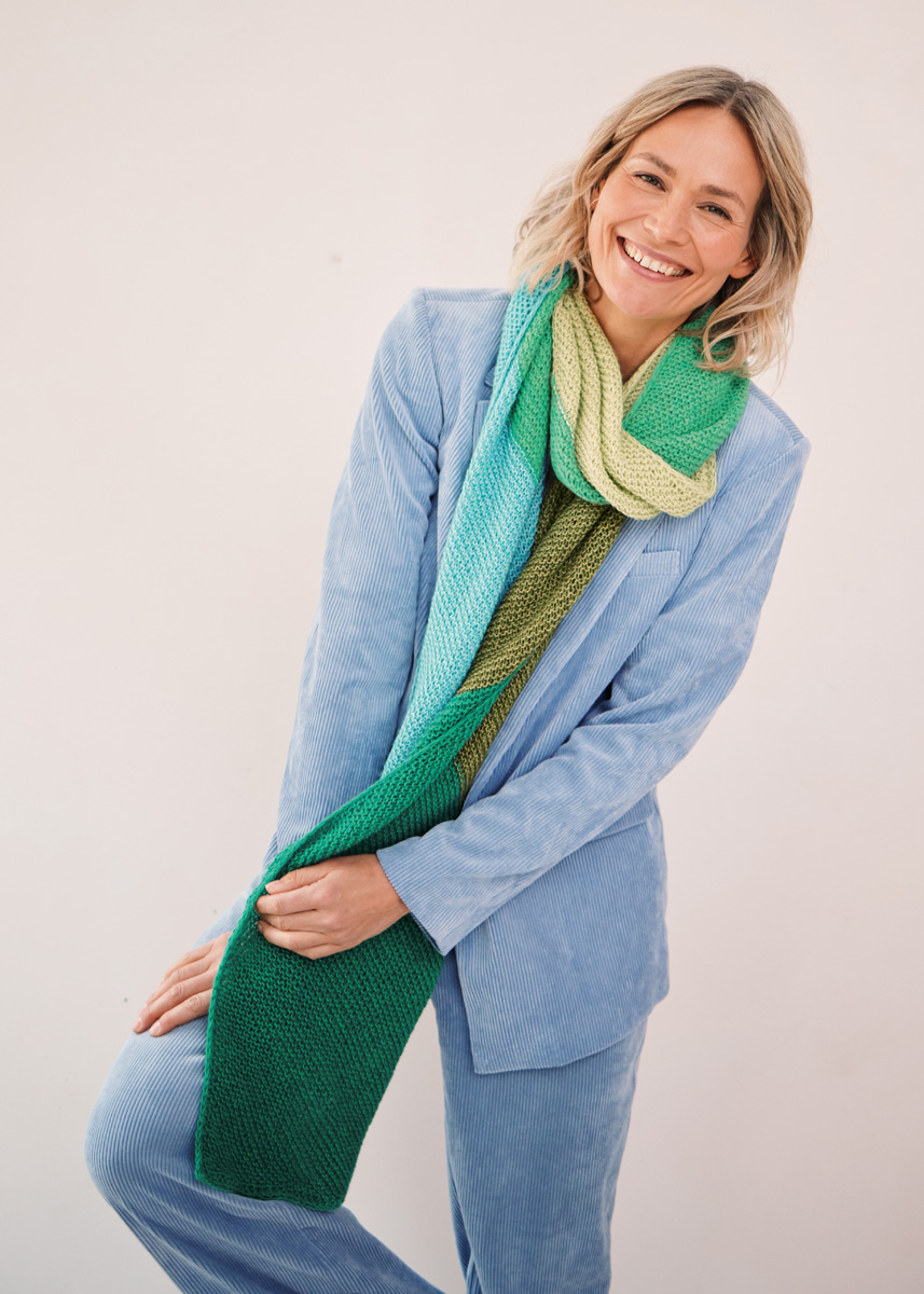 Lana Grossa Ecopuno (72 % bomull, 17 % ren ny ull (merino), 11 % alpacka (baby), löplängd 215 m/50 g), Sjal A: 50 g purpur (färg 22), 50 g hummer (färg 90), 50 g pink (färg 71), 50 g lysande orange (färg 89) och 50 g geraniumrosa (färg 82), Sjal B: 50 g turkos (färg 28), 50 g majgrön (färg 87), 50 g mjuk grön (färg 78), 50 g äppelgrön (färg 2) och 50 g grön (färg 41); stickor nr. 5 och 2 maskmarkörer.
