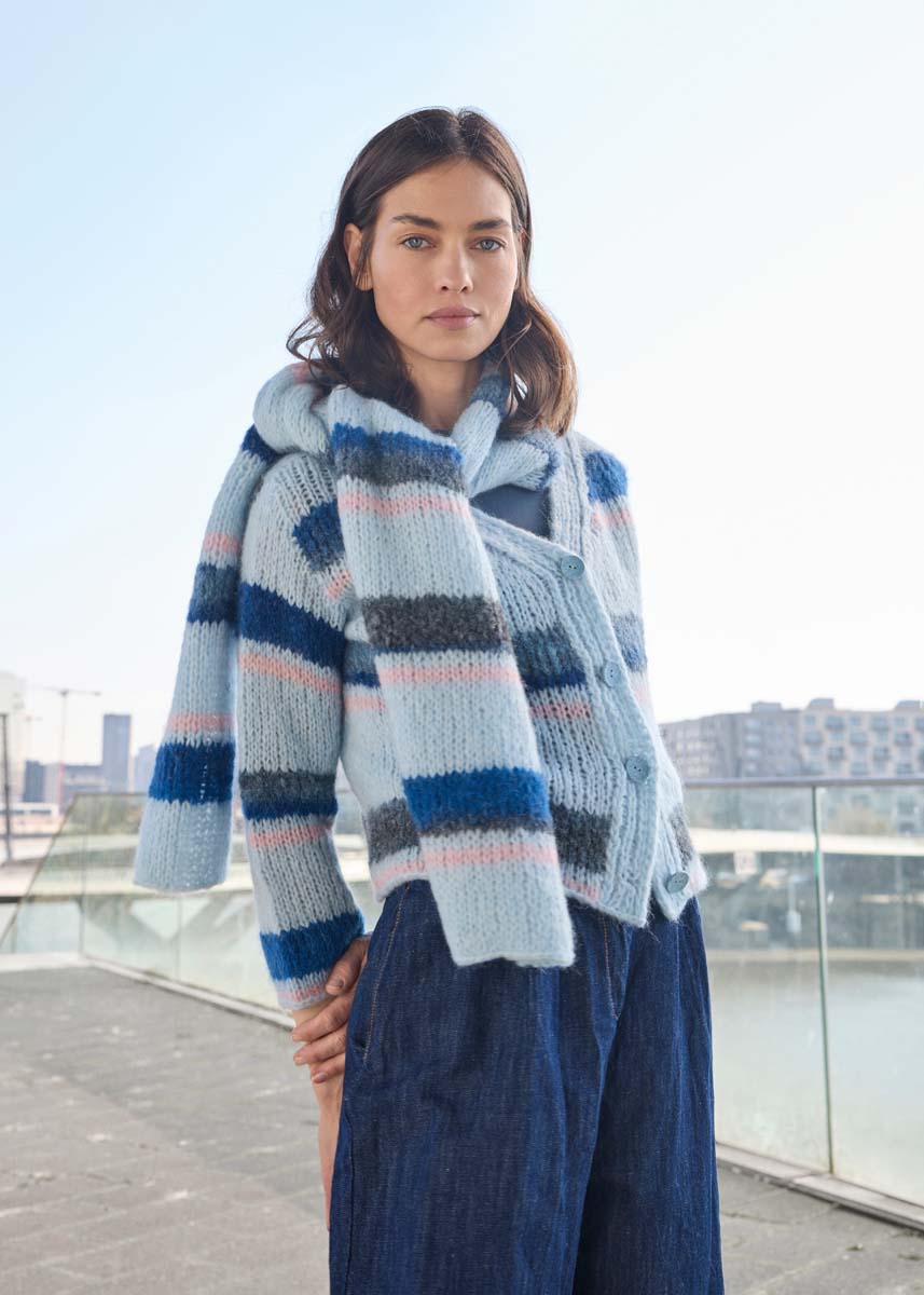 Lana Grossa-kvalitet „Alpaca Air II“ (50 % alpakka (baby), 27 % polyamid, 14 % bomull, 9 % ren ny ull (merino ), løpelengde = ca 140 m/50 g): 100 g pastellblå (farge 28), 50 g gammelrosa (farge 29), Lana Grossa-kvalitet „Gigante“ (70 % alpakka (fin), 30 % polyamid, løpelengde = ca 300 m/100 g): ca 100 g mørkblå/nattblå/gråblå/grå (farge 7); strikkepinner nr. 8.