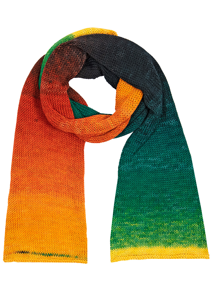 Sjal 4: Lana Grossa Gomitolo Aloha (50% bomull, 50% viskos, löplängd 250 m/100 g) 200 g grågrön/rödviolett/gammalrosa/rost/gul/jade/petrol/turkos (färg 310); stickor nr. 4,5.