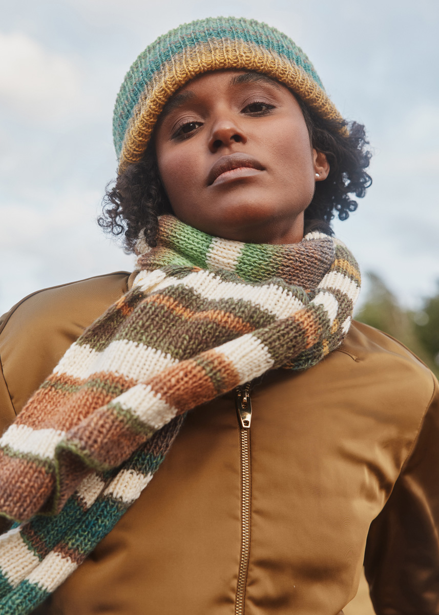 Lana Grossa-kvalitet „Gomitolo Arte“ (60 % ren ny ull, 40 % polyacryl, löplängd = ca 700 m/200 g): 1 nystan = ca 200 g senapsgul/kamel/ljusgrön/petrol/gröngrå/gråbrun (färg 1012) och „Merino Uno“ (100 % ren ny ull (merino), löplängd = ca 125 m/50 g): 2 nystan = ca 100 g ecru (färg 2); stickor nr. 5. TIPS: Garnet som blir över i Gomitolo Arte räcker till mössa Modell 27.