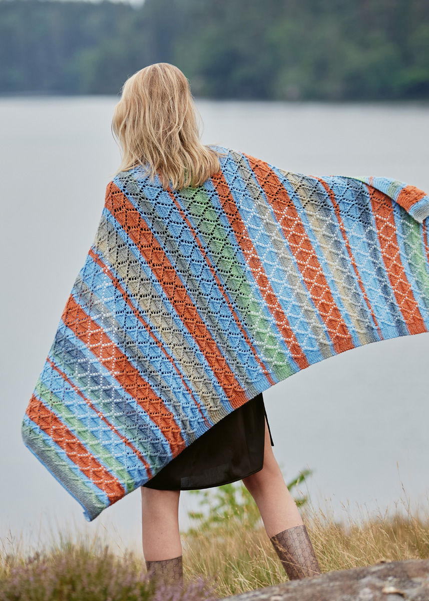 Lana Grossa-kvalitet „Gomitolo Tosca“ (60 % ren ny ull, 40 % polyacryl, löplängd = ca 700 m/200 g): ca 400 g grågrön/ violblå/terrakotta/grå (färg 167); stickor nr. 4.