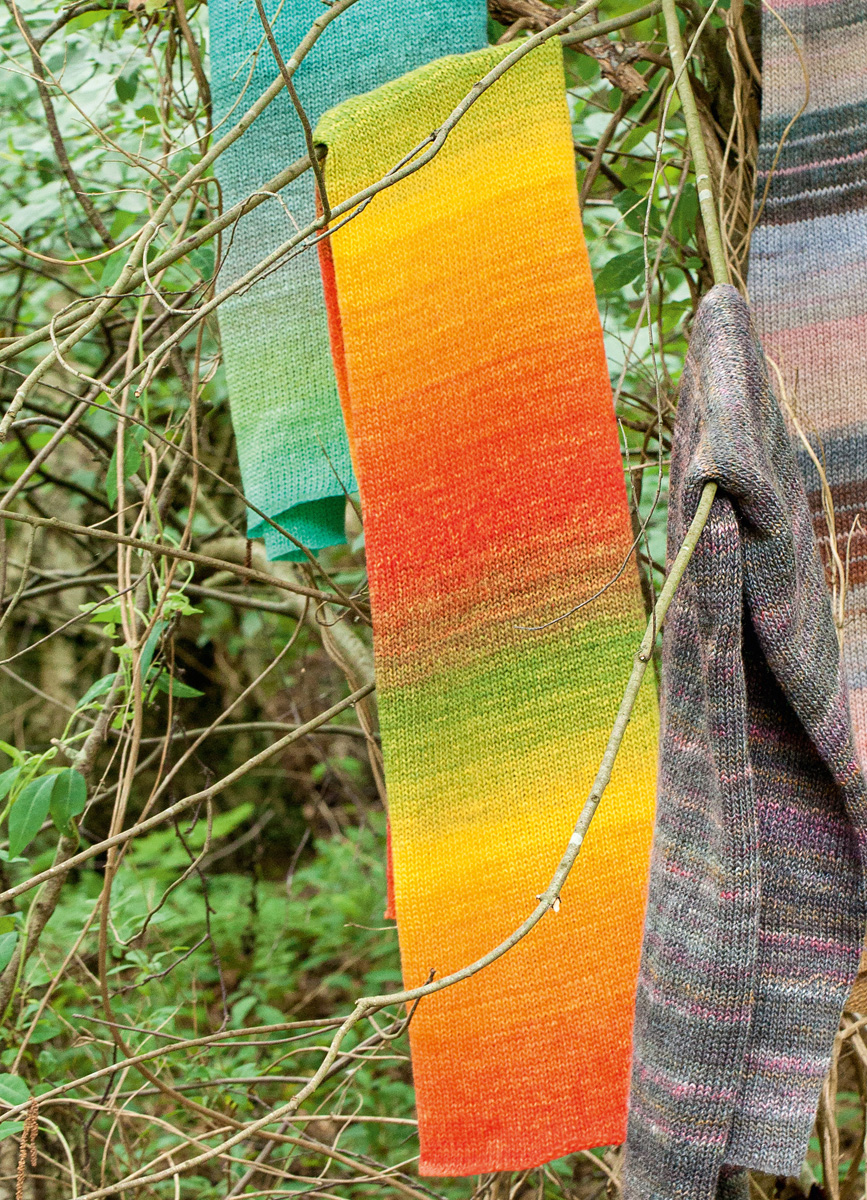 Lana Grossa ”Gomitolo Versione” (60 % ren ny uld, 40 % polyakryl, løbelængde 700 m / 200 gr), 200 gr petrol/grå/kiwi/smaragd/turkis (fv 414), eller oliven/rød/orange/gul/gulgrøn/grøn (fv 411), eller bordeaux/turkis/ sortgrøn/gulgrøn (fv 416), strikkepinde nr. 4½
