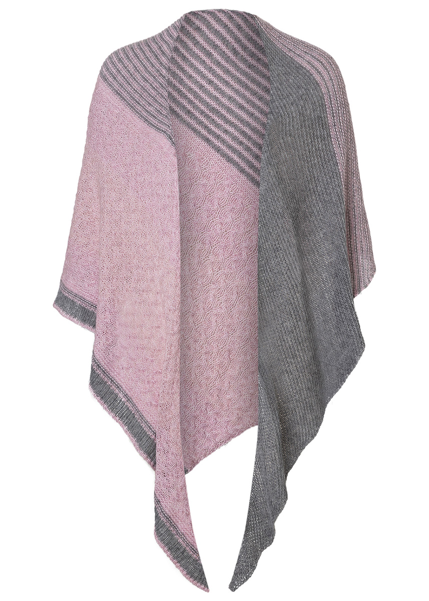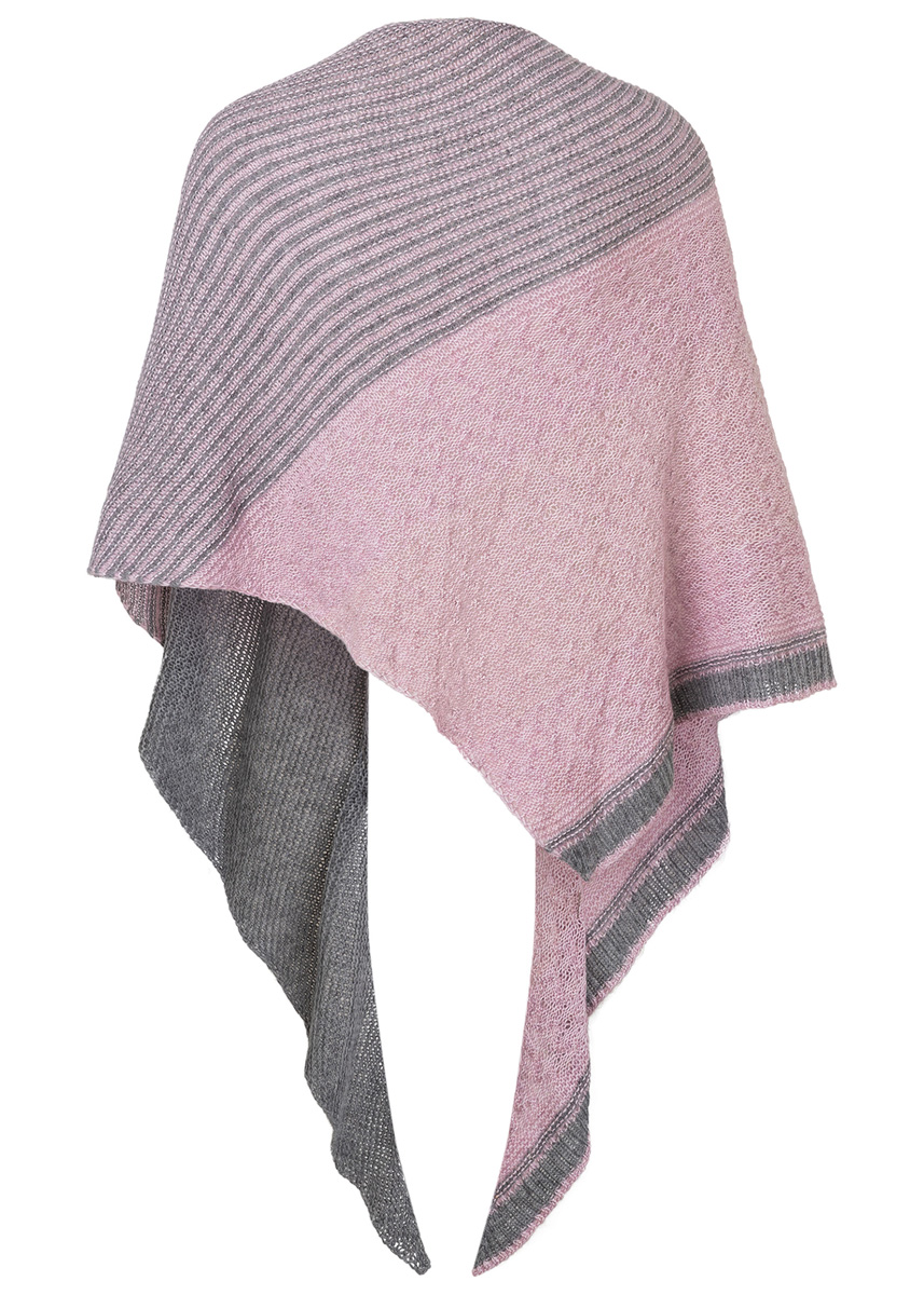 Lana Grossa-kvalitet ”Ecopuno” (72 % bomuld, 17 % ren ny merino, 11 % baby alpaka, løbelængde = ca. 215 m / 50 gr.): ca. 100 gr grå (fv 56) og 150 gr syren (fv 8), rundpind nr. 4, 100 cm, maskemarkører