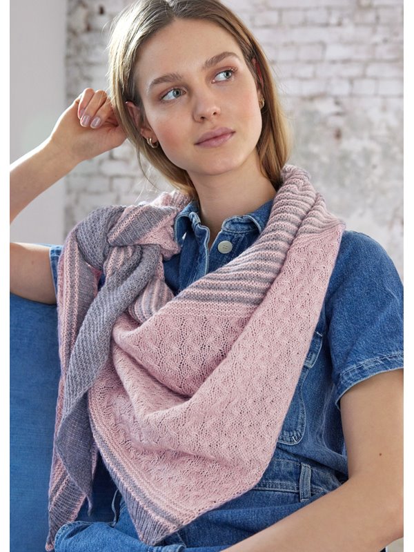 Sjal med striber og snoninger. Sjalet strikkes på tværs fra højre mod venstre. Det har en let asymmetrisk trekantet form. Str.: 210 cm x 65 cm, bredde og dybde