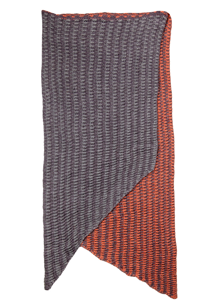 Lana Grossa Lace Seta Mulberry (35% silke (mulberry), 35% baby alpacka, 30% ren ny ull merino ekstrafin, löplängd 175 m/50 g), 250 g plommon (färg 5), 150 g laxröd (färg 8) och 100 g grå (färg 14); 1 rundsticka nr. 3,5, 120 cm lång och 1 virknål nr. 3,5.