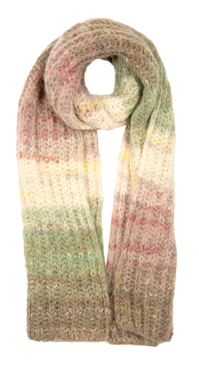 Lana Grossa kvalitet „Lala Berlin Hazy“ (40% (baby) alpacka, 25% ren ny ull (merino superfine), 25% polyamid, 6% Tencel, 4% bomull, löplängd= 250 m/50 g): 50 g rosa/jordgubbe (färg 1), 50 g mjuk grön/beige (färg 3), 50 g beige/karamell (färg 4), 50 g råvit/syren/rosa (färg 9), rundsticka nr. 8.