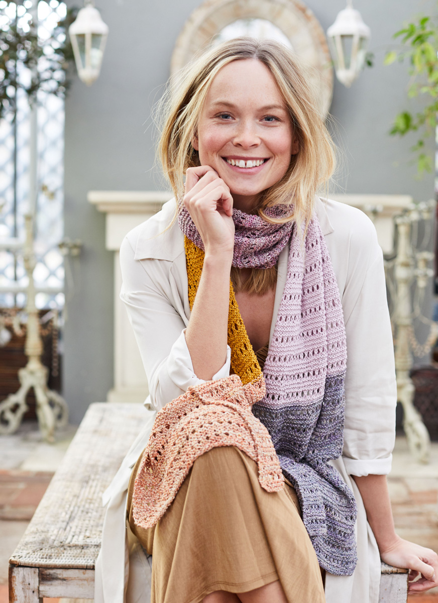 Lana Grossa-kvalitet „Landlust Sommerseide“ (50% silke, 50% bomull, löplängd ca. 170 m/50 g), stickor nr. 4,5 Pastellfärgad sjal: 50 g varje av orange melerad (färg 101), guldgul (färg 18), rosa melerad (färg 102), gammelrosa (färg 14), anthracit melerad (färg 103).