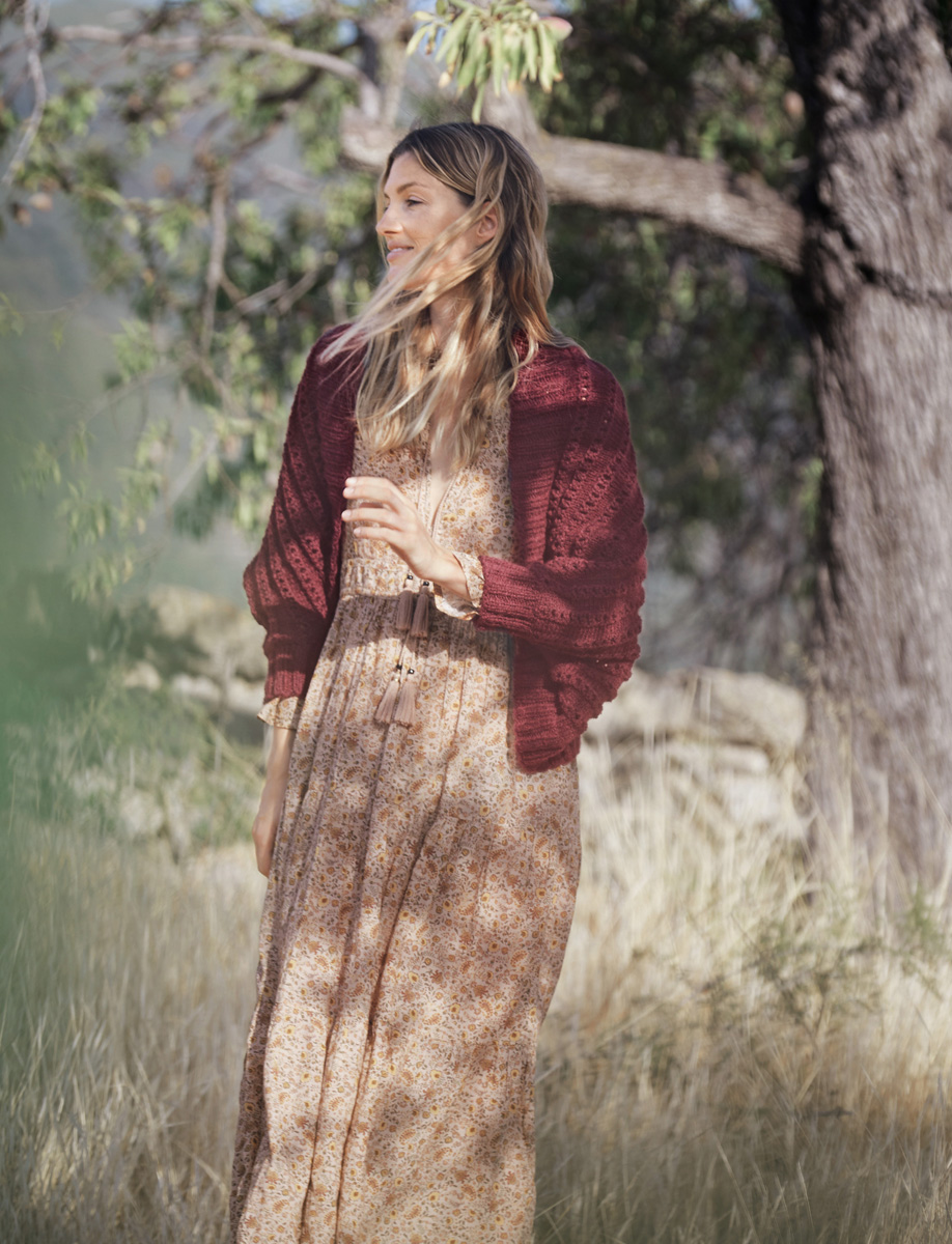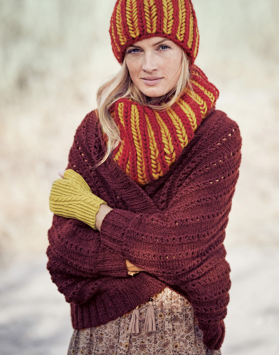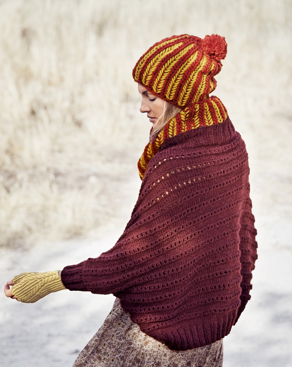 Lana Grossa Alta Moda Alpaca (90% alpacka, 5% ren ny ull, 5% polyamid, löplängd 140 m/50 g), 300 (350/400) g i mörk röd melerad (färg 40); stickor nr. 5,5; strumpstickor nr. 5,5.