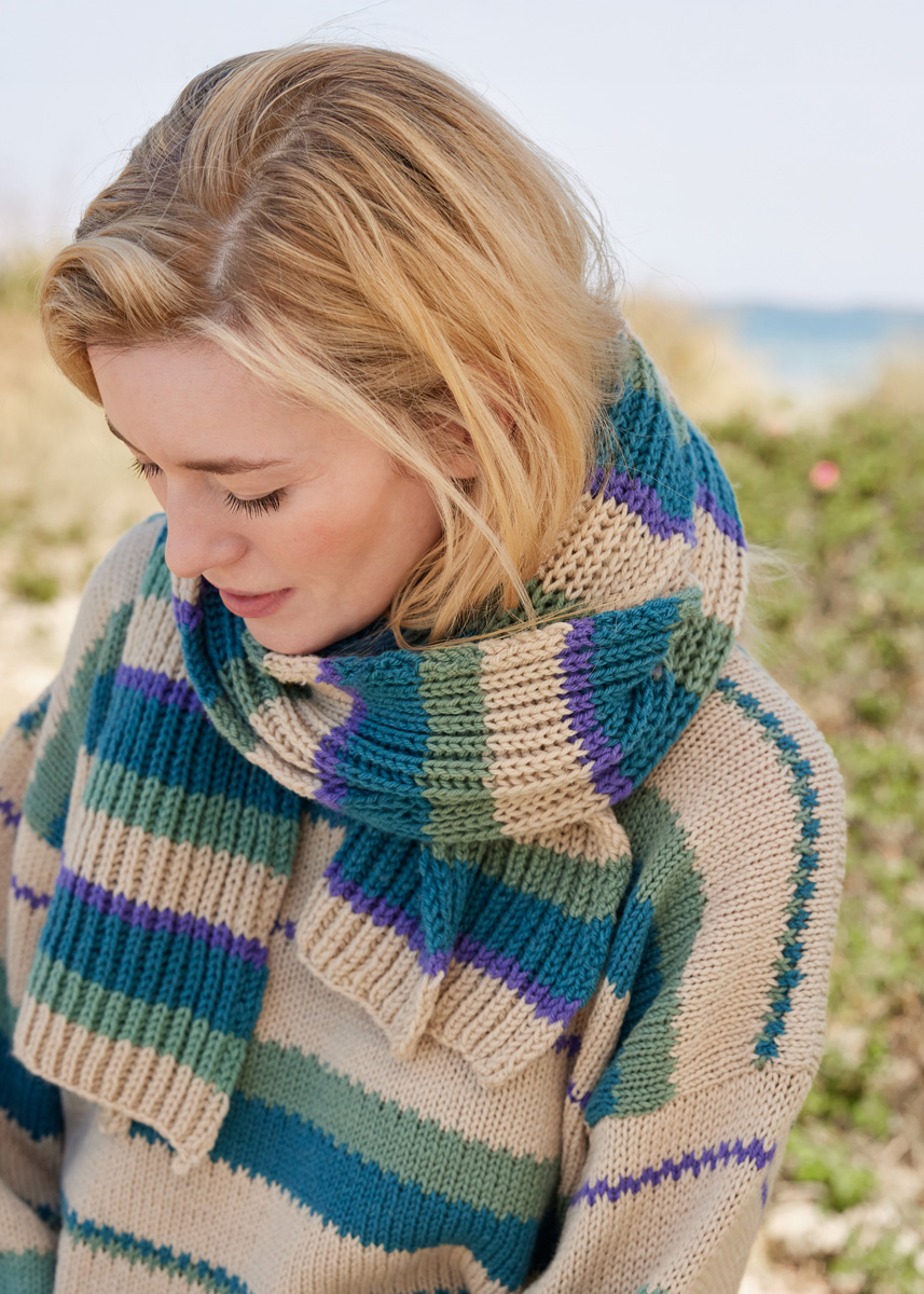 Lana Grossa Merino Uno (100 % ren ny ull (merino), LL = ca 125 m/50 g), 100 g resadagrønn (frg 34), 100 g petrol (frg 60), 100 g grège (frg 55), 50 g fiolett (frg 86) Pinner: Nr. 6