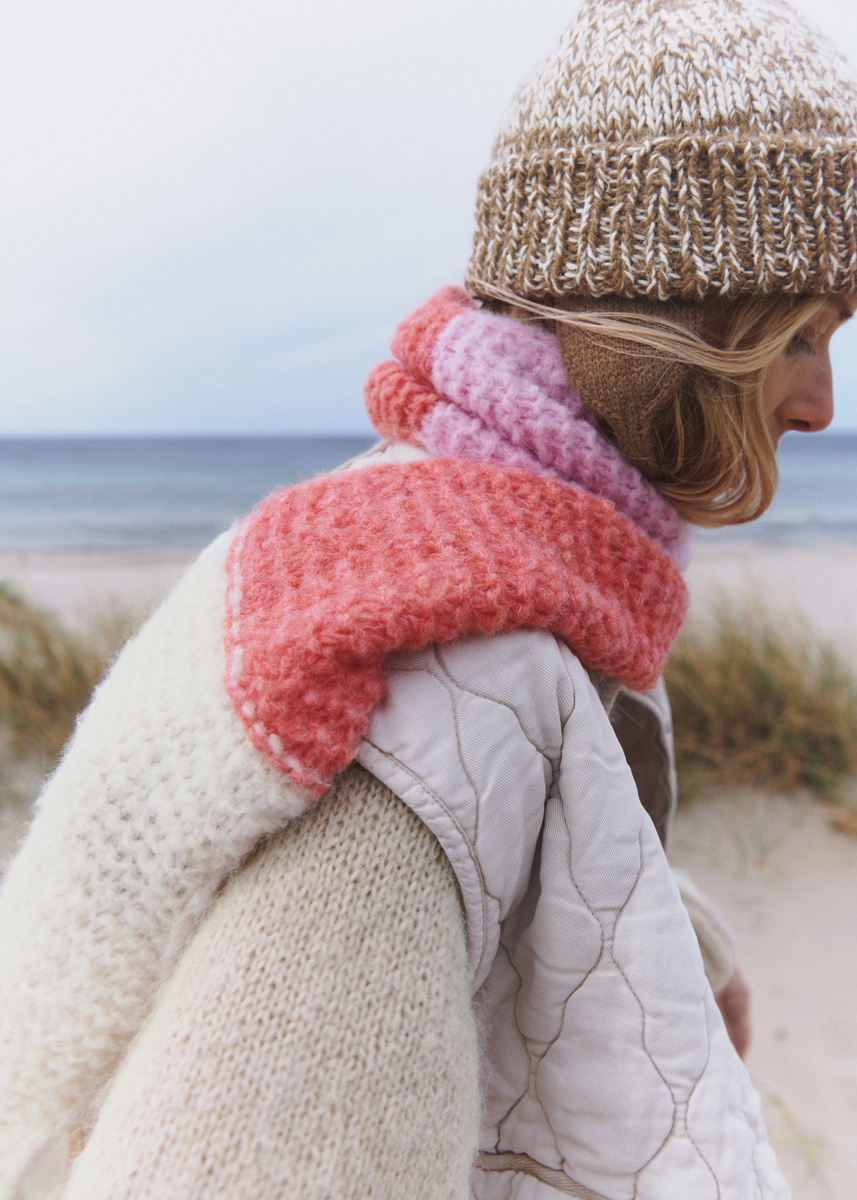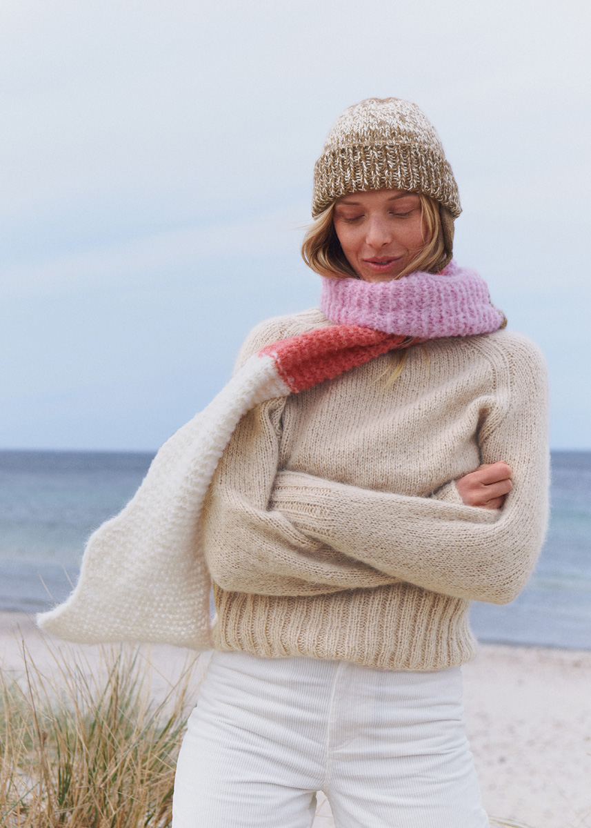 Lana Grossa-kvalitet „Natural Alpaca Lungo“ (89 % alpacka (baby), 11 % polyamid; löplängd = 190 m/50 g): 50 g var i råvit (färg 01), brun (färg 3), ljusröd (färg 11) och rosa (färg 14); stickor nr. 7. Tips: Modellen stickas med dubbla trådar.