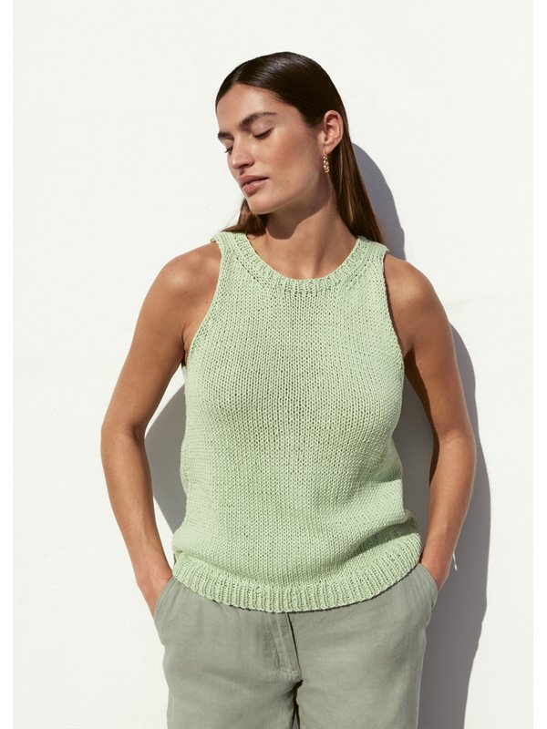 Lana Grossa-kvalitet „Organico” (100 % (Bio) bomull, löplängd = ca. 90 m/50 g): ca. 250 (300 – 350) g lindgrön (färg 144); stickor nr. 3 och 5, 5, 1 rundsticka nr. 3, 50 cm lång.
