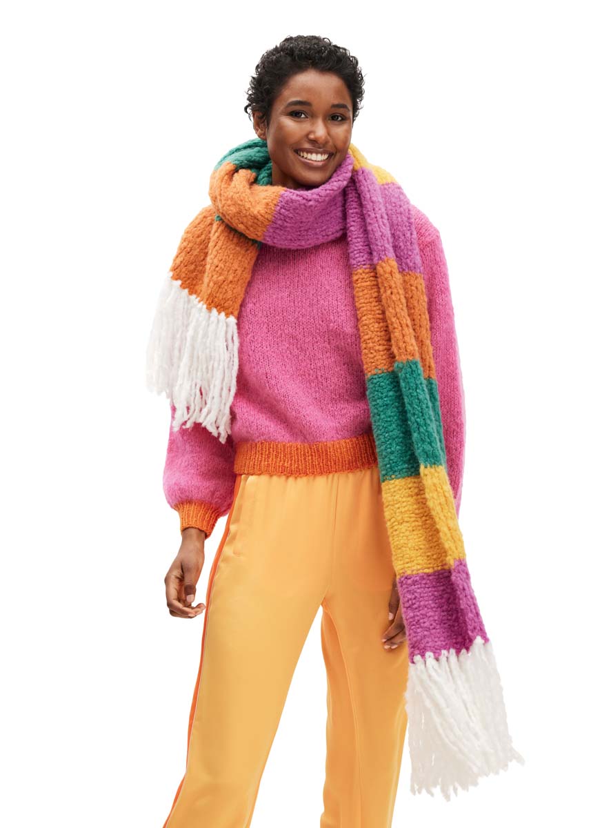 Lana Grossa-kvalitet „Royal Alpaca” (93 % alpacka (royal), 7 % polyamid, löplängd = ca. 95 m/50 g): ca. 50 g var i orange (färg 4), smaragd (färg 13), gul (färg 3), orkidé (färg 6) och vit (färg 1); stickor nr. 8, 1 virknål nr. 7.