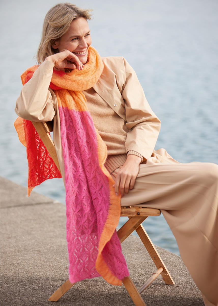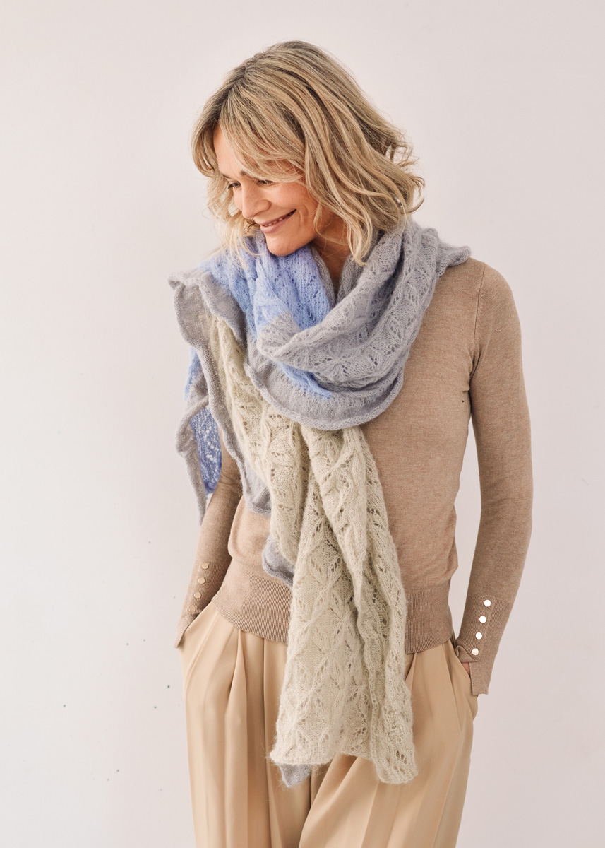 Lana Grossa Setasuri (69 % alpacka (Suri), 31 % silke, löplängd 212 m/25 g), Sjal A: 75 g ljus grå (färg 19), 50 g Perlbeige (färg 36) och 50 g violblå (färg 27); Sjal B: 75 g lax (färg 22), 50 g hummer (färg 23) och 50 g pink (färg 24); Sjal C: 75 g vitgrön (färg 29), 50 g turkos (färg 28) och 50 g Frühlingsgrön (färg 51); stickor nr. 3,5 och 1 rundsticka nr. 3,5, 120 cm lång, 2 flätstickor.