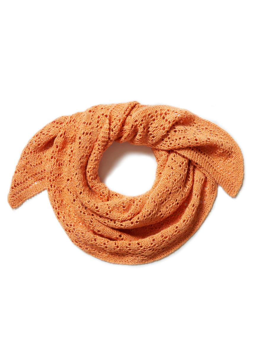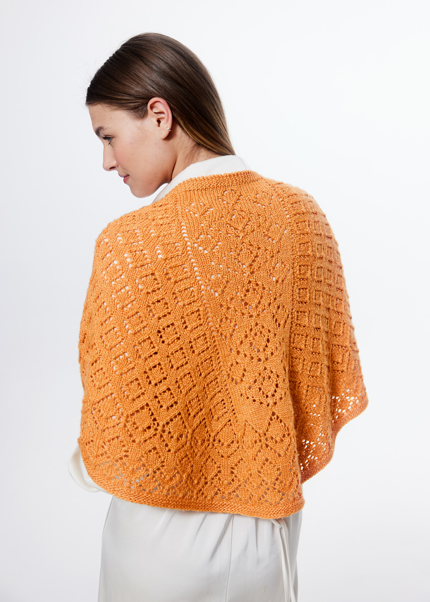 Lana Grossa Setosa (65% ren ny ull (merino superfin), 35% silke, löplängd 150 m/50 g), 250 g orange (färg 7); 1 rundsticka nr. 4,5, 80 – 100 cm lång, 1 extra vajer, 2 maskmarkörer.