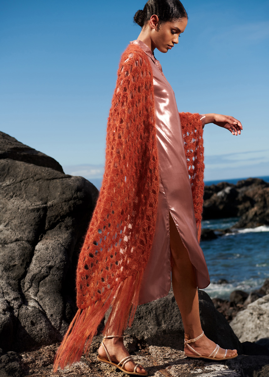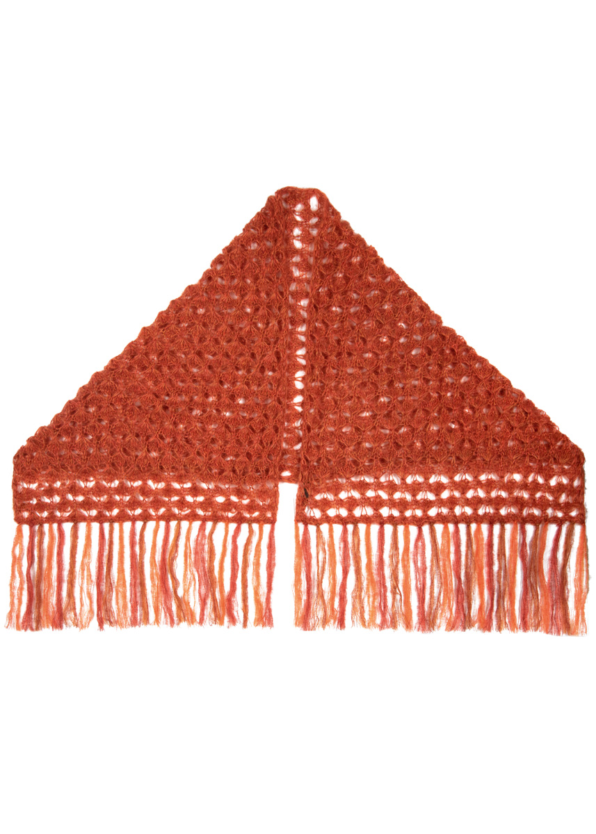 Lana Grossa-kvalitet „Silkhair” (70 % mohair (superkid), 30 % silke, löplängd = ca. 210 m/25 g): ca. 75 g var av röd (färg 145), kanel (färg 124) och orange (färg 125); stickor nr. 9, 1 virknål nr. 5 (till fransarna).