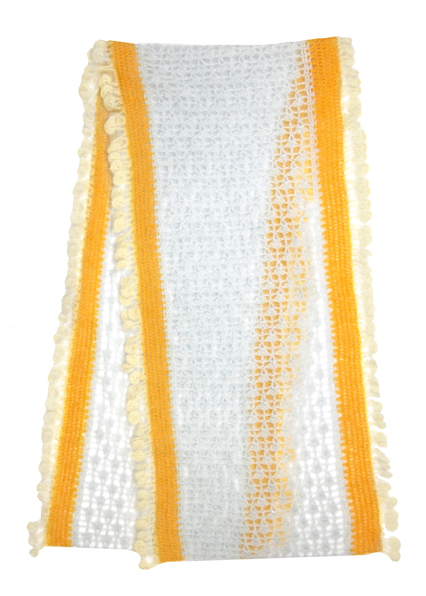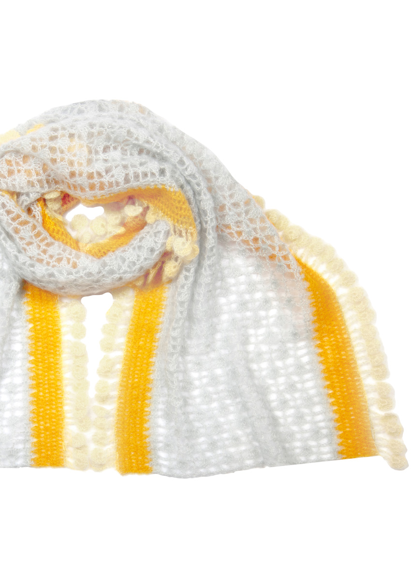 Lana Grossa Silkhair (70% mohair, 30% silke, löplängd 210 m/25 g), 75 g silvergrå (färg 41), 50 g bärnsten (färg 146) och 50 g råvit (färg 52); 1 virknål nr. 4.