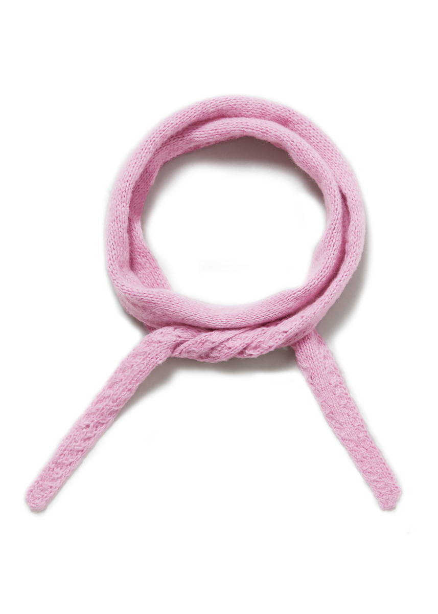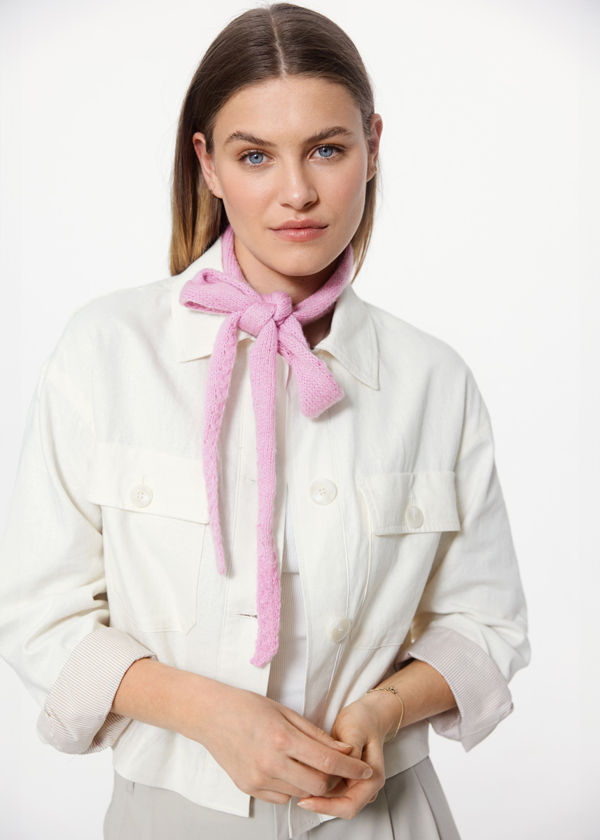 Lana Grossa Soffio (60% ren ny ull (merino superfin), 30% (bio) bomull, 10% kashmir, löplängd 212 m/25 g), 50 g rosa (färg. 1) och Lana Grossa Cool Wool Lace (100% ren ny ull (merino extrafin), löplängd 400 m/50 g), 50 g rosa (färg. 52); stickor nr. 4 och 2 maskmarkörer.